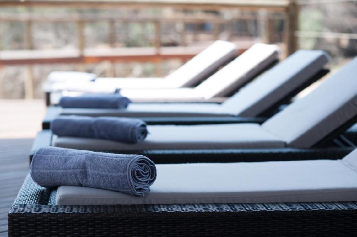 Comfortable pool loungers arranged for ultimate relaxation by the water’s edge.