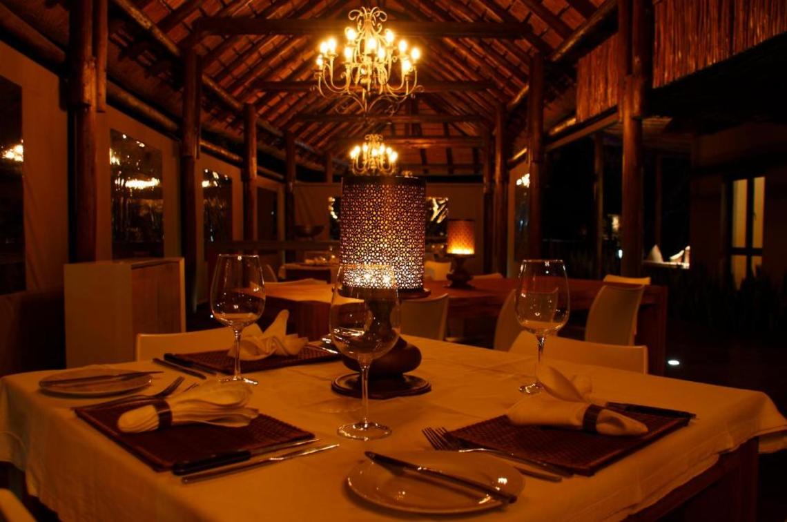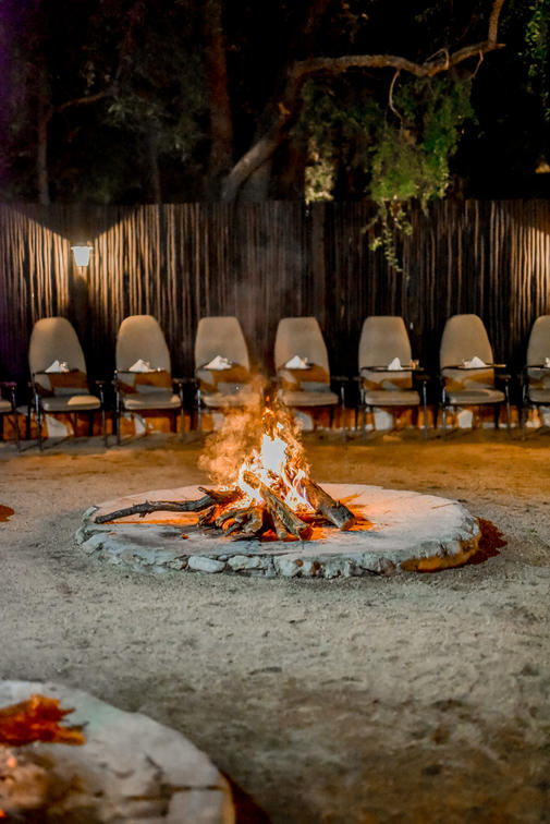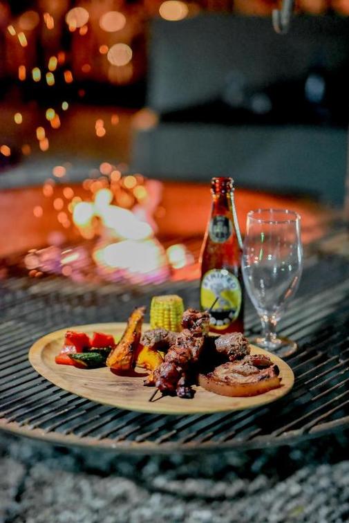 An authentic boma dinner experience featuring traditional cuisine served around a warm, open fire beneath the stars.