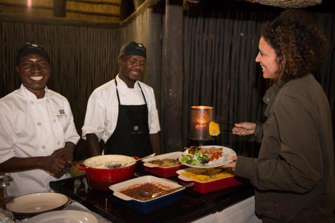 A traditional boma dinner featuring flavorful local cuisine enjoyed around a crackling fire under the night sky.