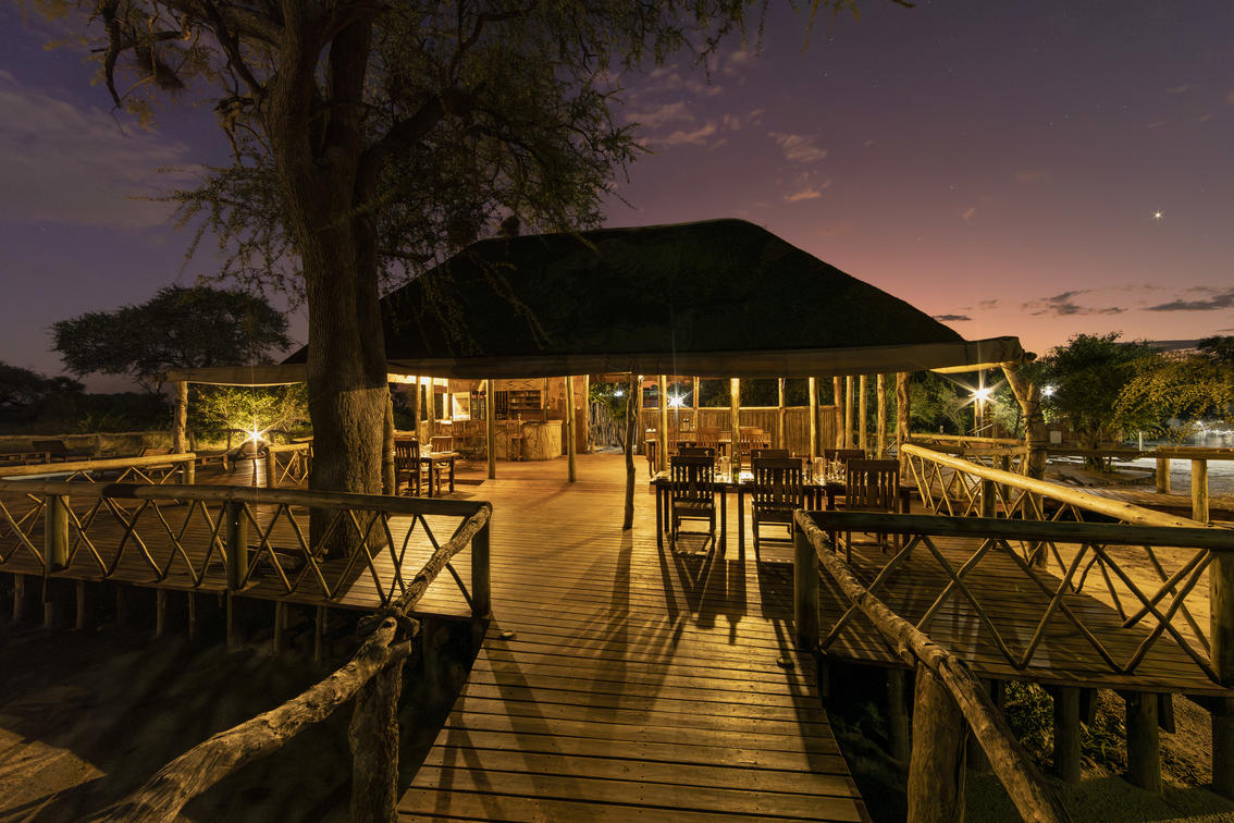 The indoor dining area overlooking the waterhole at Mogogelo Camp