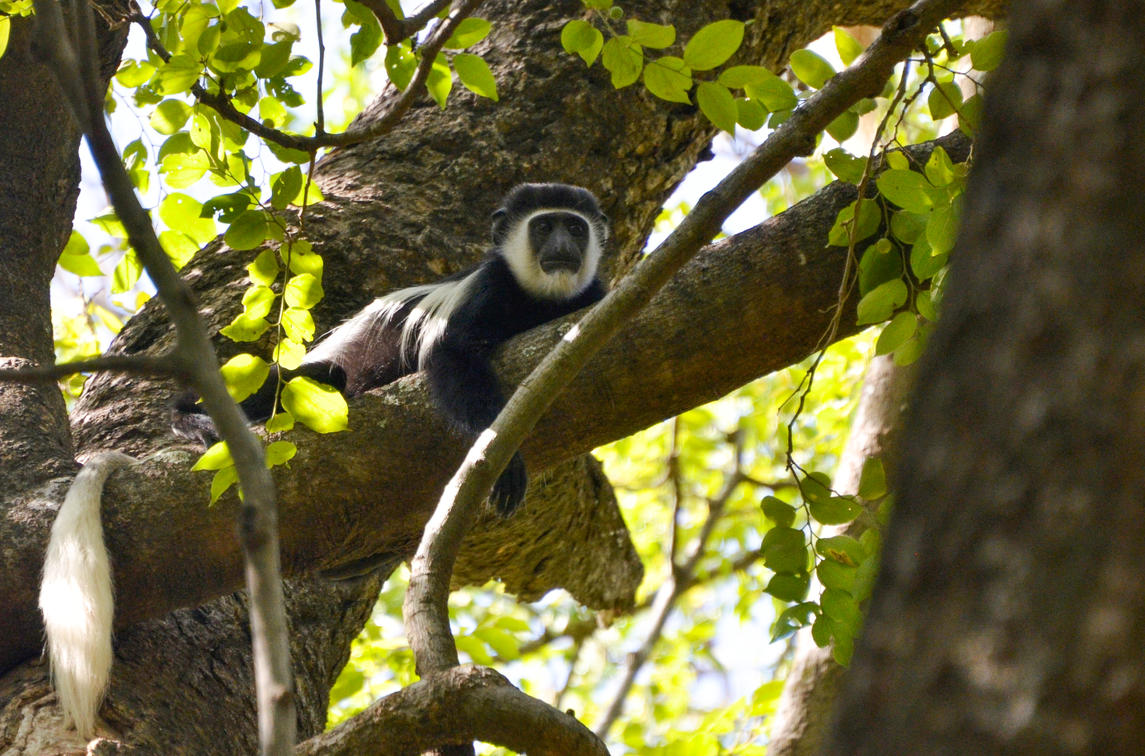 guereza colobus are resident in camp and regularly seen along the banks of the river
