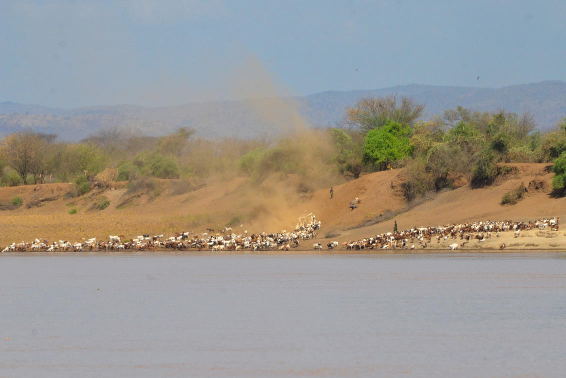 large goat herds come down to the river to drink in clouds of dust - they are vulnerable to both the crocodiles here and the hyaenas further inland