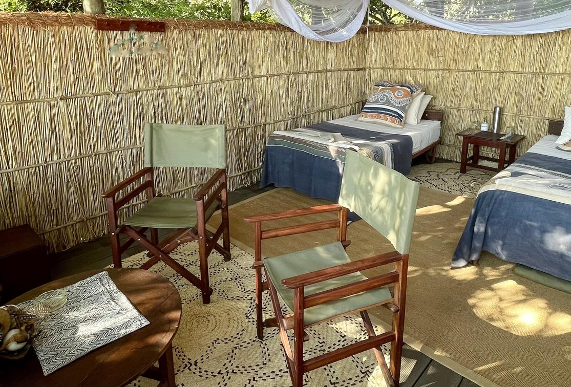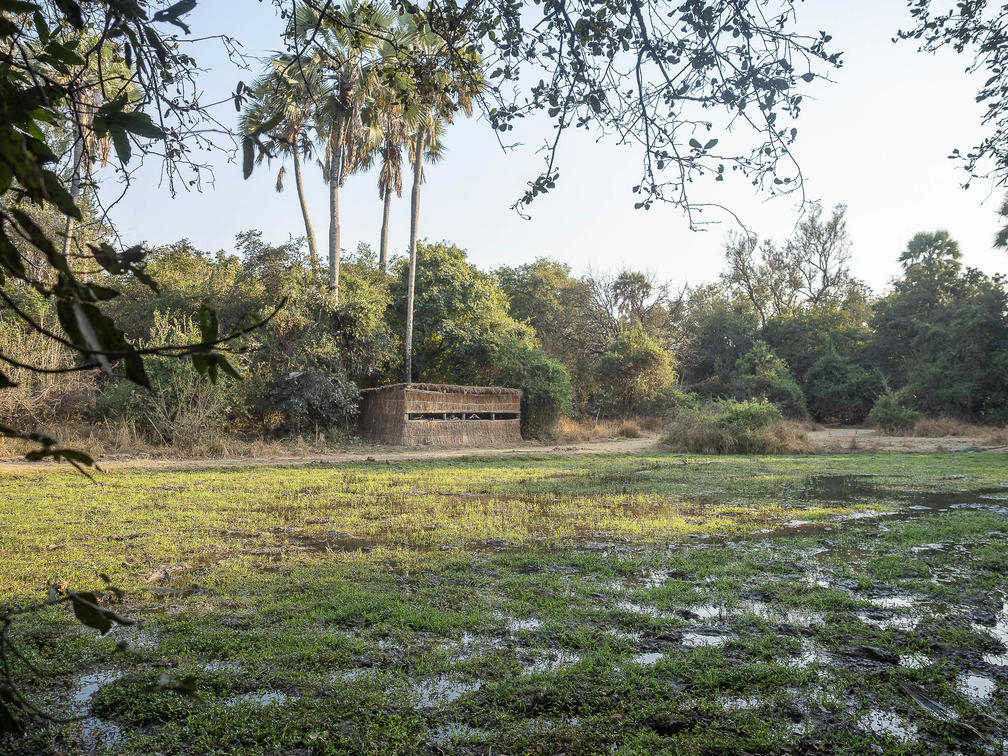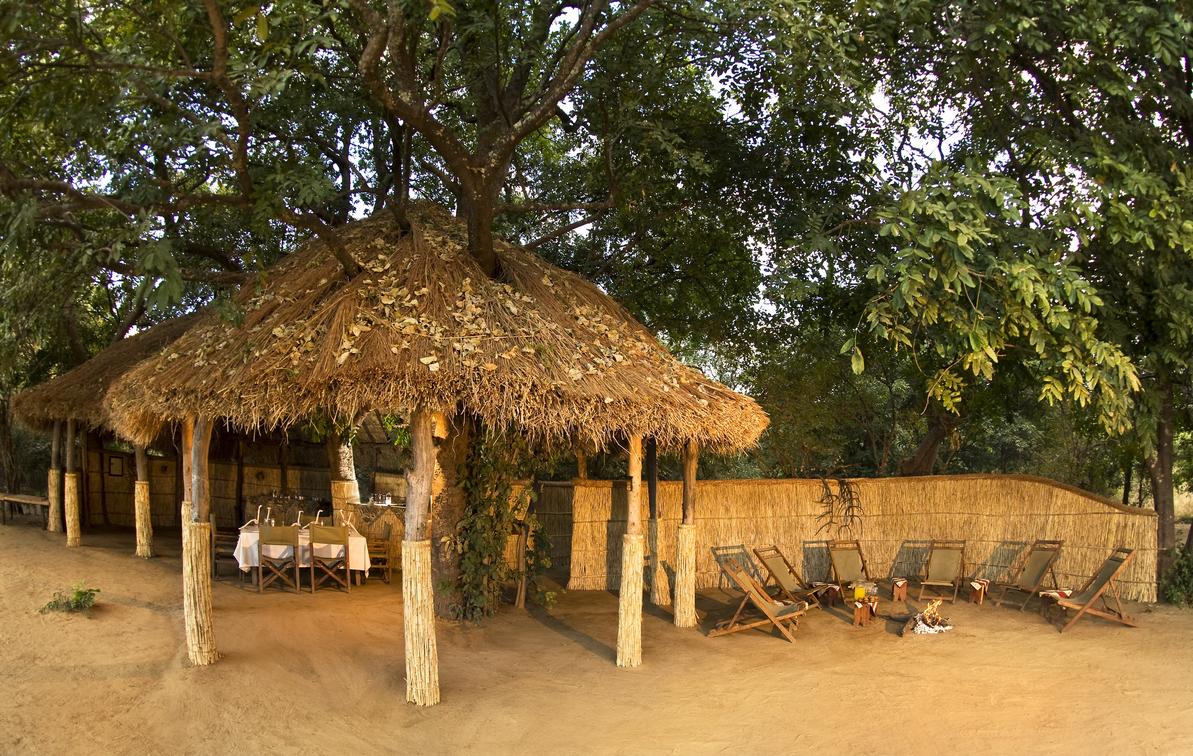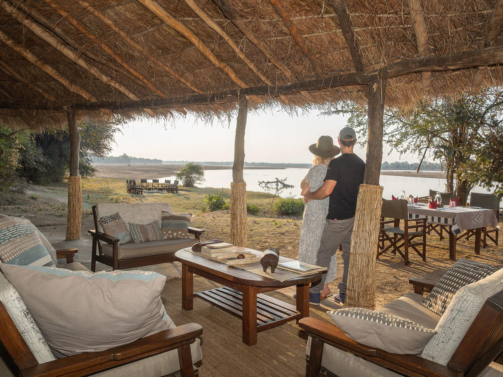 Each reed chalet is built on stilts, overlooking the Luangwa River