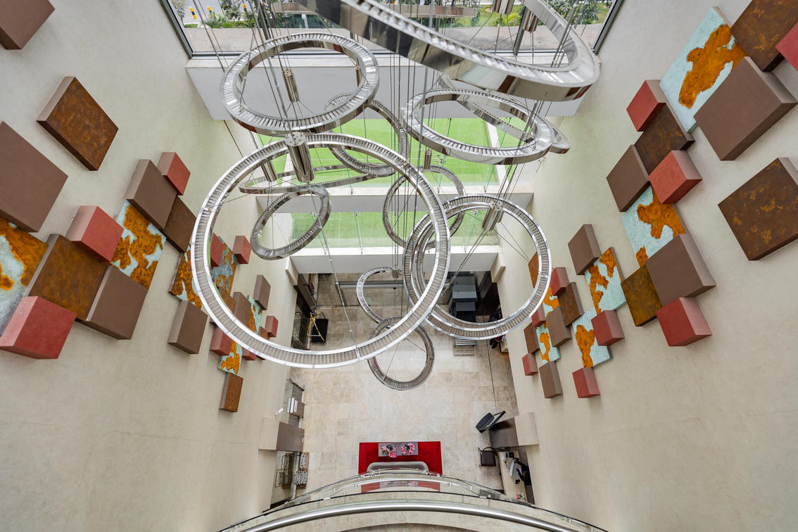 Overhead view of hotel's atrium with striking circular chandeliers and abstract wall art, conveying contemporary elegance