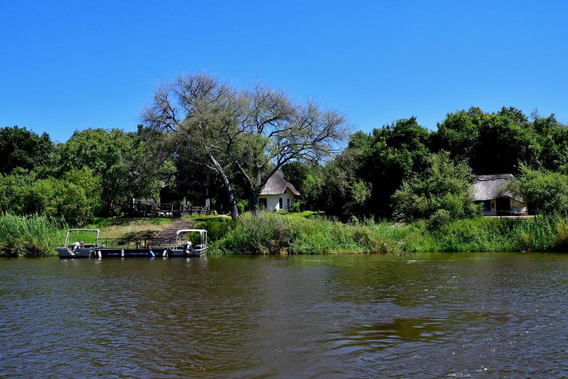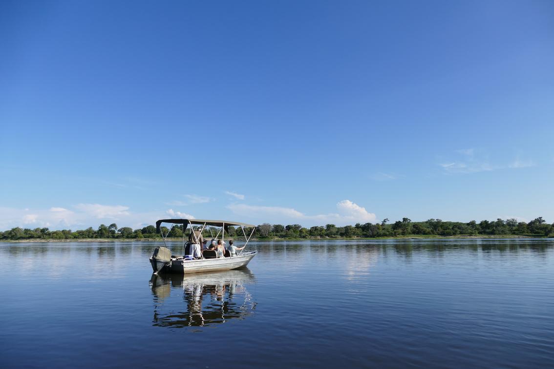 The lodge lawn overlooks the Zambezi and the national park beyond