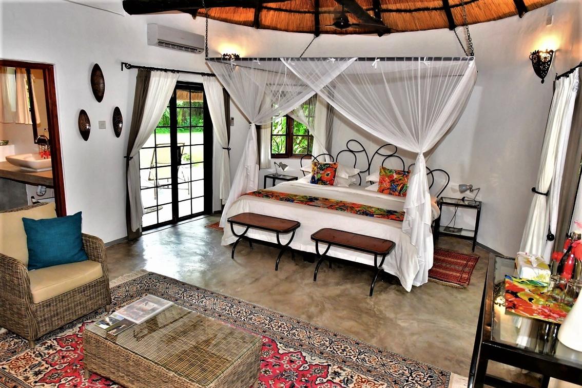 Luxury safari tents in the Waterberry private conservation area. Superking bed, seating area with sofa and desk, bar fridge and tea and coffee station, thatched shower room extension with shower, basin, dressing area, storage.