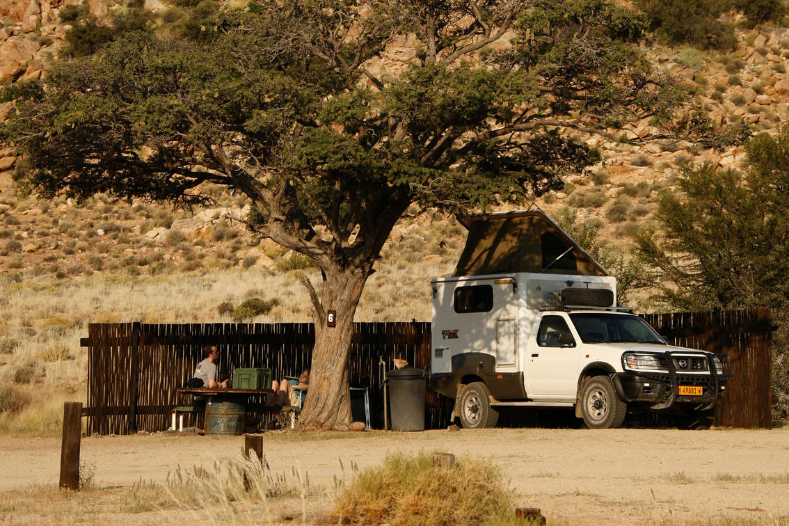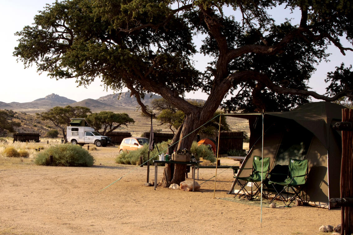 Large old camel thorn trees greet camping guests at the Desert Horse Campsite in a small valley of the Aus mountains.