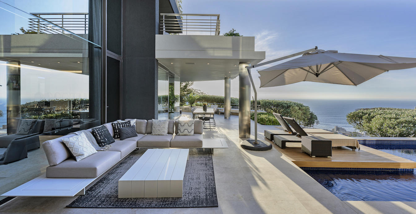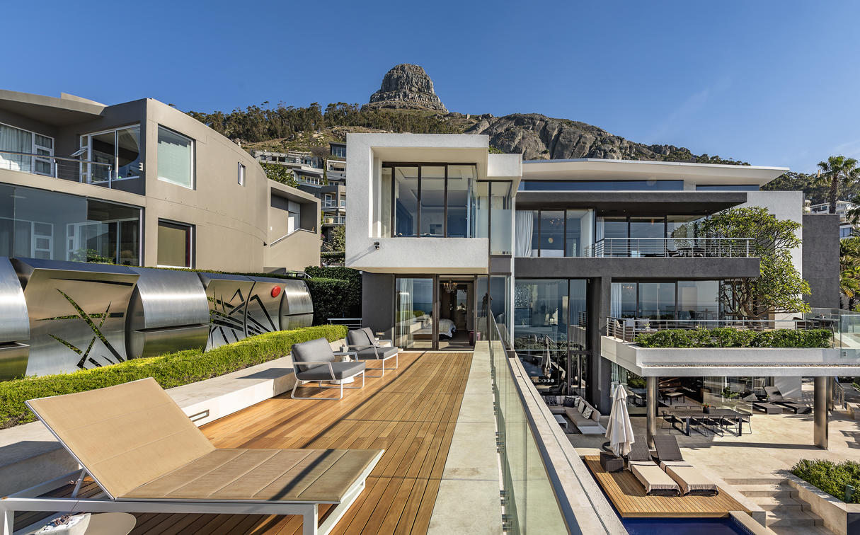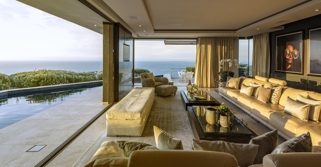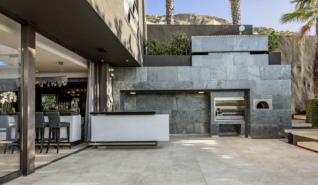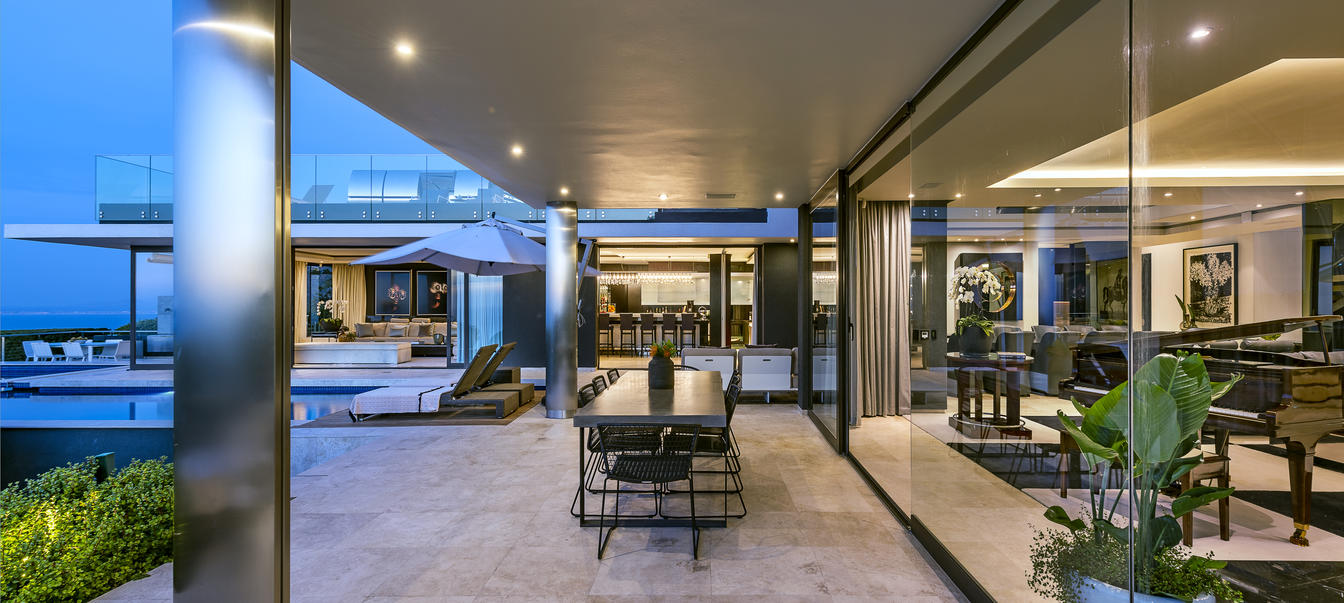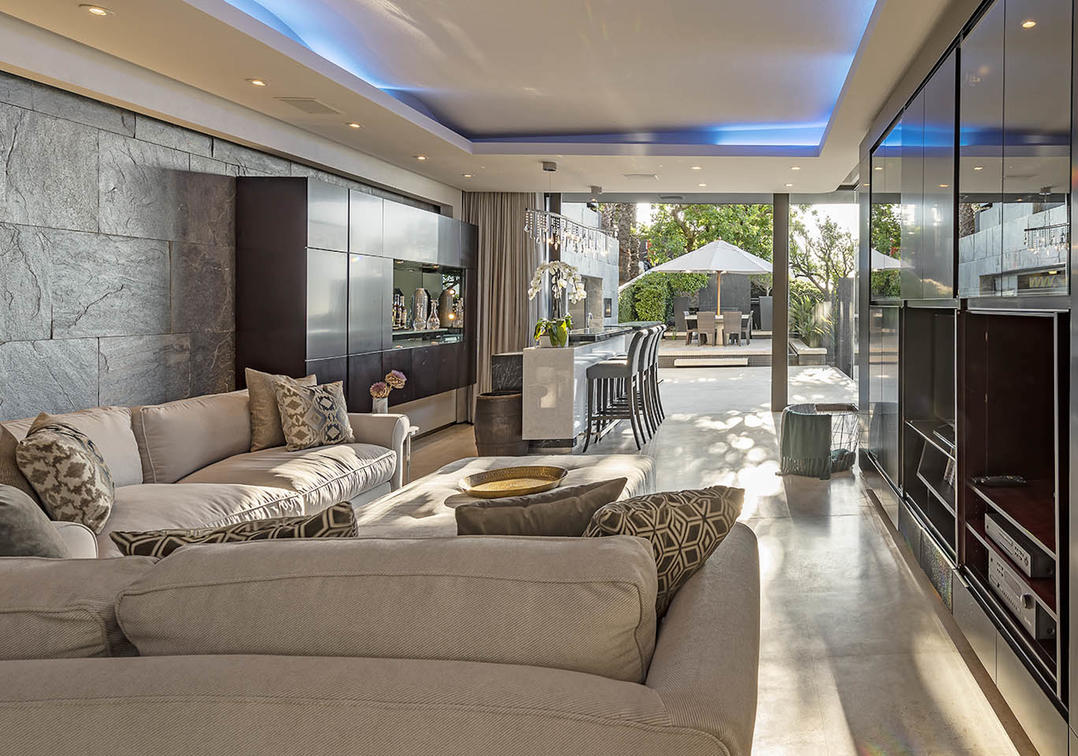 This is the main entertainment lounge set with 2 TV's, a bar, a north facing braai and alongside the pool.