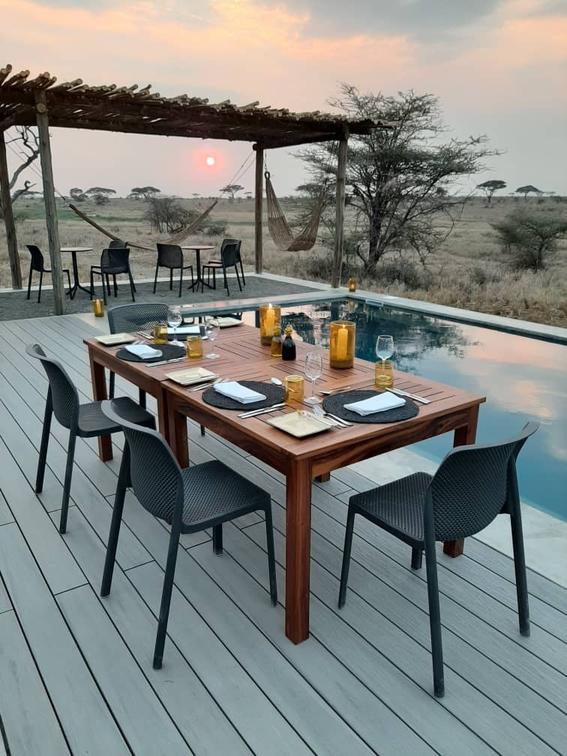 Namiri Plains - Tent Deck with Bath, Sunbeds and Cushion Corner