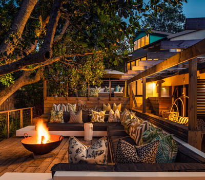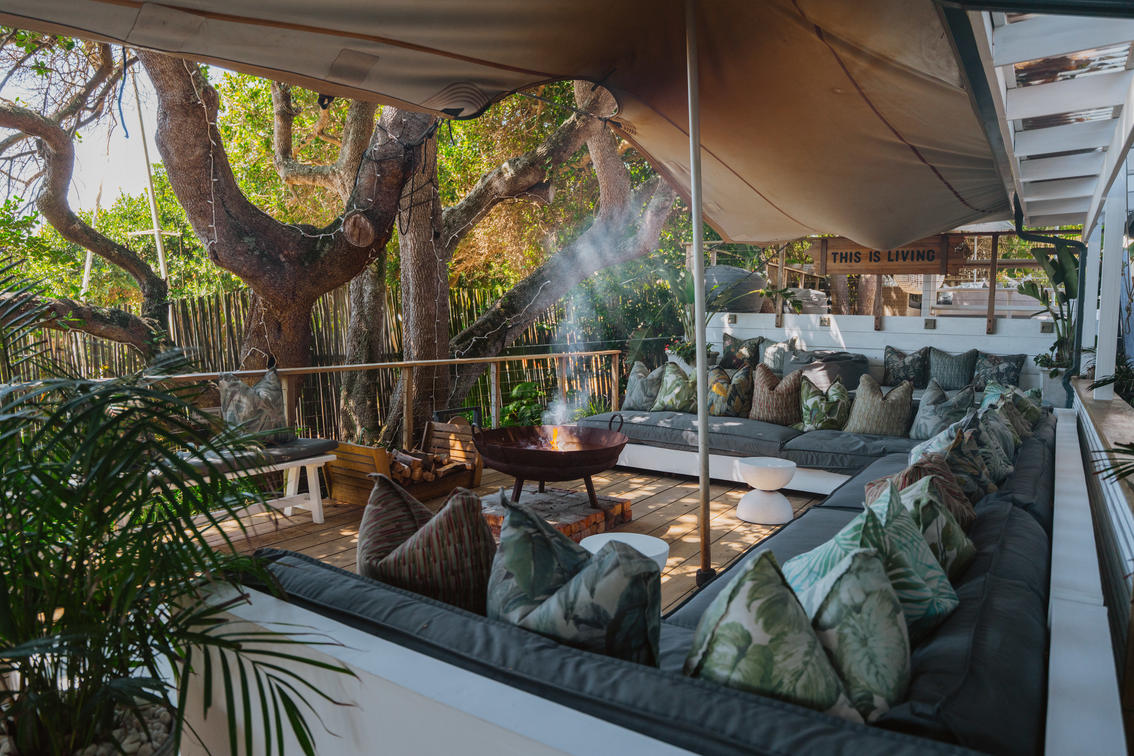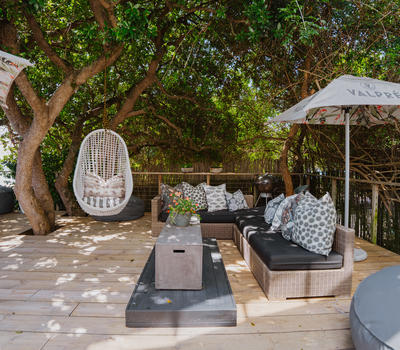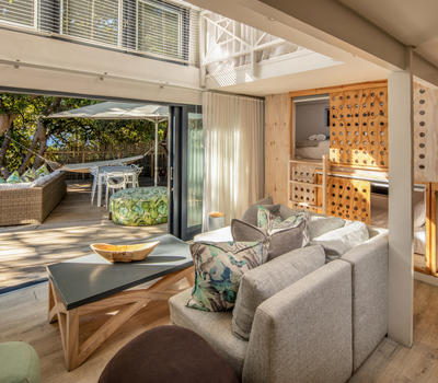 Deluxe Rooms. lead onto an inviting outdoor lounge with a canopy of ancient milkwood trees. A firepit gives a warm ambience on balmy summer evenings.