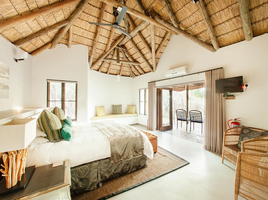 Fitted with contemporary elegance and quality furnishings. Surrounded by striking Tambuti Trees, all the suites offer bush views and privacy, each air-conditioned with en-suite bathroom equipped with twin hand basins, bath, indoor and showers, separate toilet, complete with a private deck.