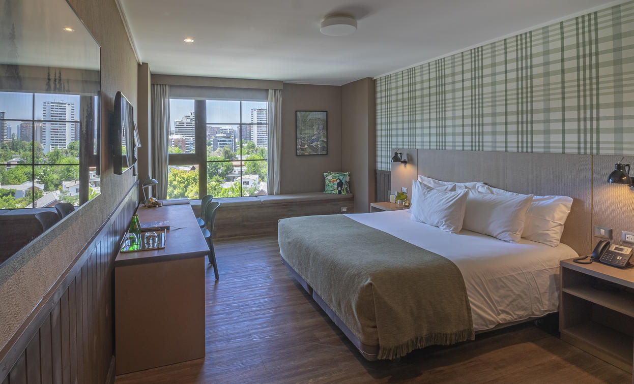 Los espaciosos interiores y el confort de estilo Art Deco definen nuestra asombrosa vista a la montaña y a la ciudad desde una cómoda suite de un dormitorio con ventana de proa que cuenta con todas las comodidades necesarias para disfrutar al máximo mientras disfruta de su hogar lejos del hogar. Con una cama king size, un escritorio de trabajo grande y un baño completo, su retiro en el oasis de la ciudad ofrece un descanso reparador. Duerme hasta tarde o levántate temprano para disfrutar de una taza de café recién hecha o uno de nuestros jugos prensados en frío. Después de abrir el apetito, regrese a su remanso de paz, póngase su ropa más relajante y disfrute de la mejor y más saludable cena mientras disfruta de un refrescante ramassoti o cualquiera de nuestros vinos orgánicos en el mejor ambiente de la ciudad de Santiago. Termine otro día hermoso en la comodidad de su habitación para disfrutar de su película favorita.