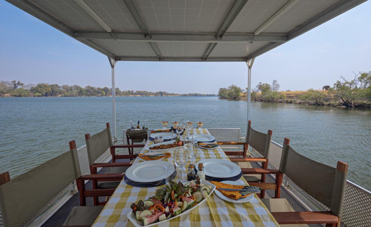 Disfrute de un día de relajación reservando un tratamiento en nuestro spa flotante y, después, relájese en nuestra piscina infinita mientras disfruta del sol africano. Tanto el spa como la piscina ofrecen impresionantes vistas del río Zambezi, donde es posible que te acompañen elefantes e hipopótamos residentes que vienen a la orilla del agua para beber, jugar y revolcarse.