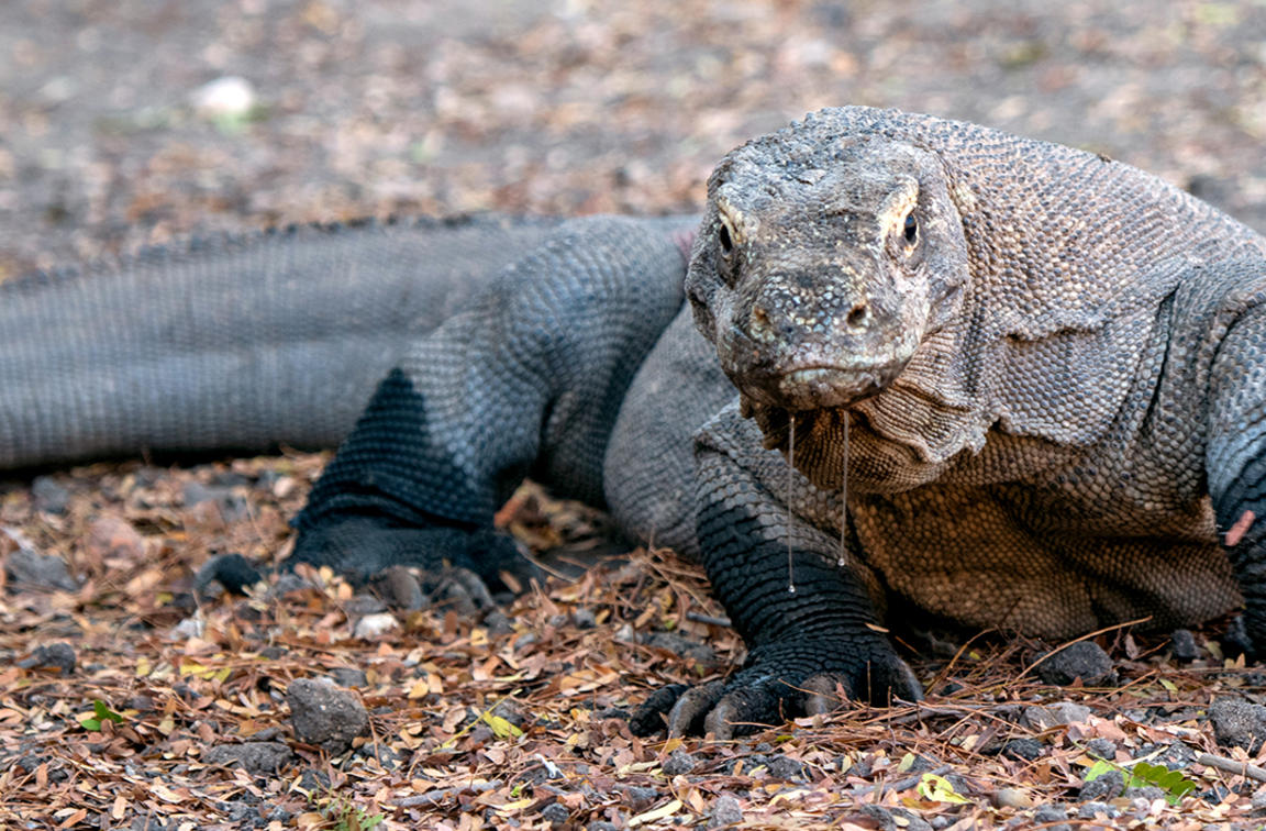 Los antiguos y raros dragones de Komodo (Varanus komodoensis) han prosperado en el duro clima de las Islas Menores de la Sonda de Indonesia durante millones de años. Con una longitud aproximada de 3 metros y un peso de más de 70 kg, el dragón de Komodo es el lagarto y el reptil más grande del mundo, con una longitud promedio de 2 a 3 metros. Los dragones se identifican por su enorme tamaño, cabezas planas, patas arqueadas, colas largas y gruesas y lenguas en forma de tenedor.