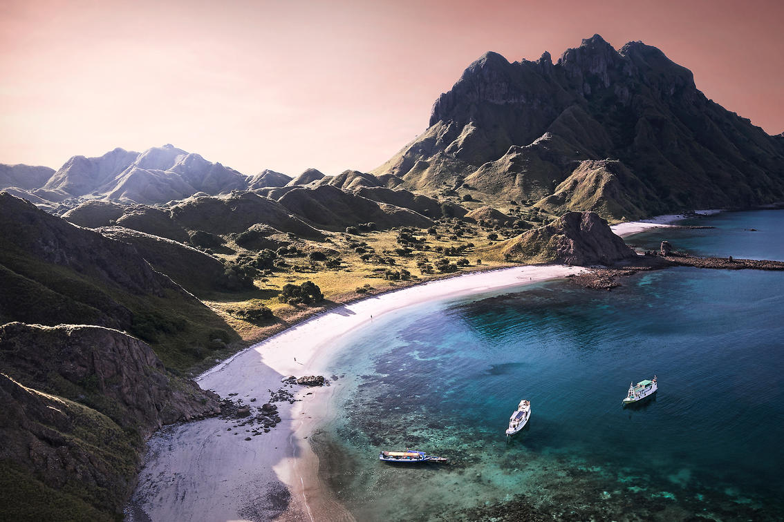Su color distintivo se crea a partir del pigmento rojo producido en los arrecifes de coral por criaturas microscópicas llamadas foraminíferos. Pequeños fragmentos del coral rojo se combinan con las arenas blancas de la playa, creando este tono específico. Aqua Blu se ancla en este lugar al final de la tarde y ofrece a nuestros huéspedes un entorno romántico y tranquilo después de un día repleto de aventuras, volcanes y dragones.