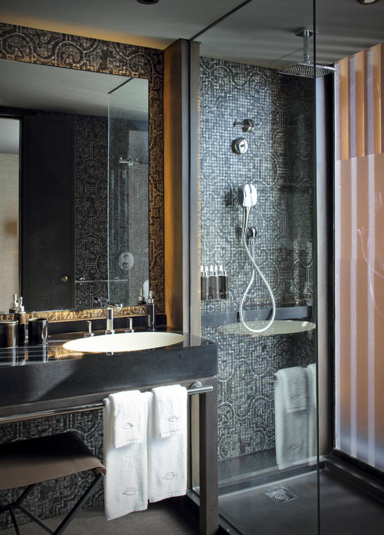 Cuarto de baño de lujo con lavabo doble y amplia ducha a ras de suelo, ducha de efecto lluvia superior y artículos de tocador y cabello orgánico natural.