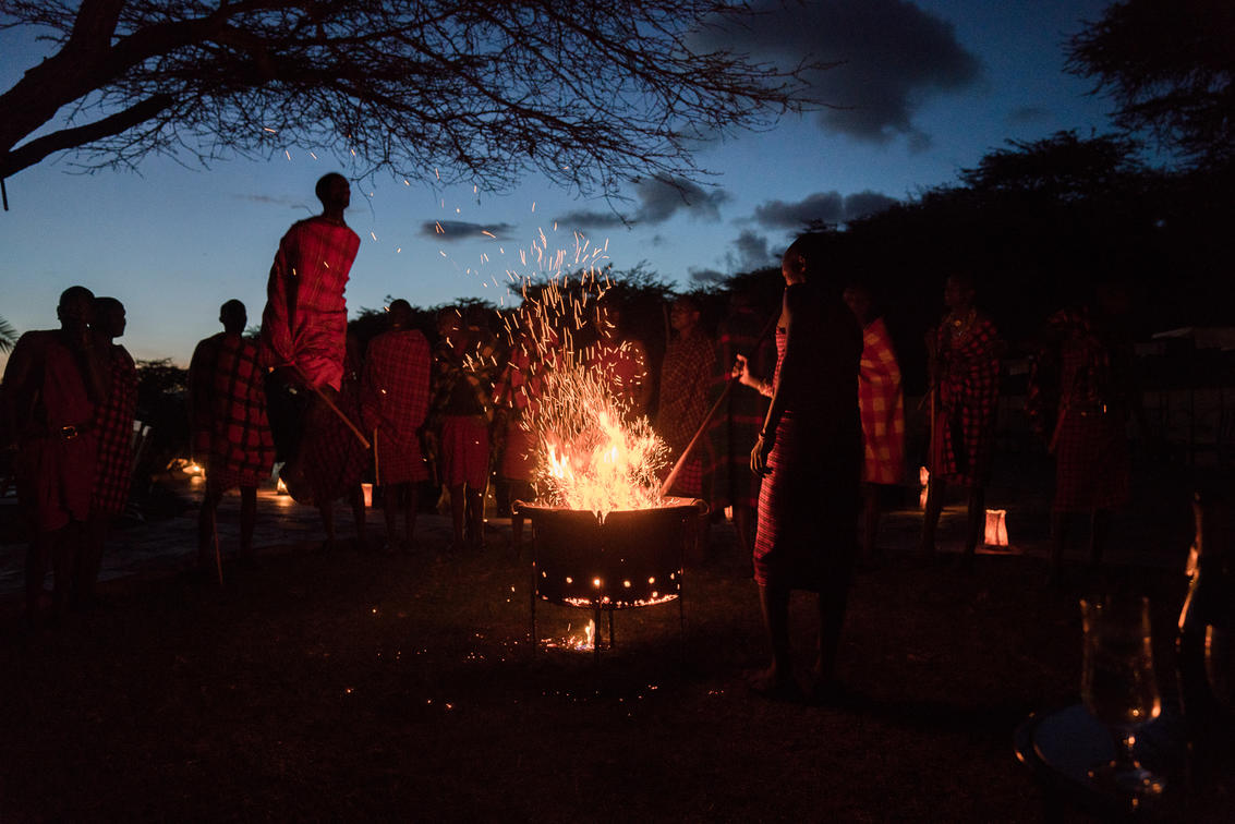 Bajo el vasto cielo africano, mientras disfrutan de un cóctel por la noche junto al fuego, los huéspedes pueden disfrutar de la tradicional celebración de la canción y la danza de nuestros guerreros masai locales.