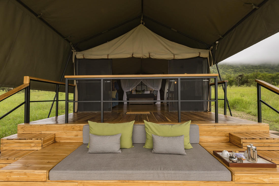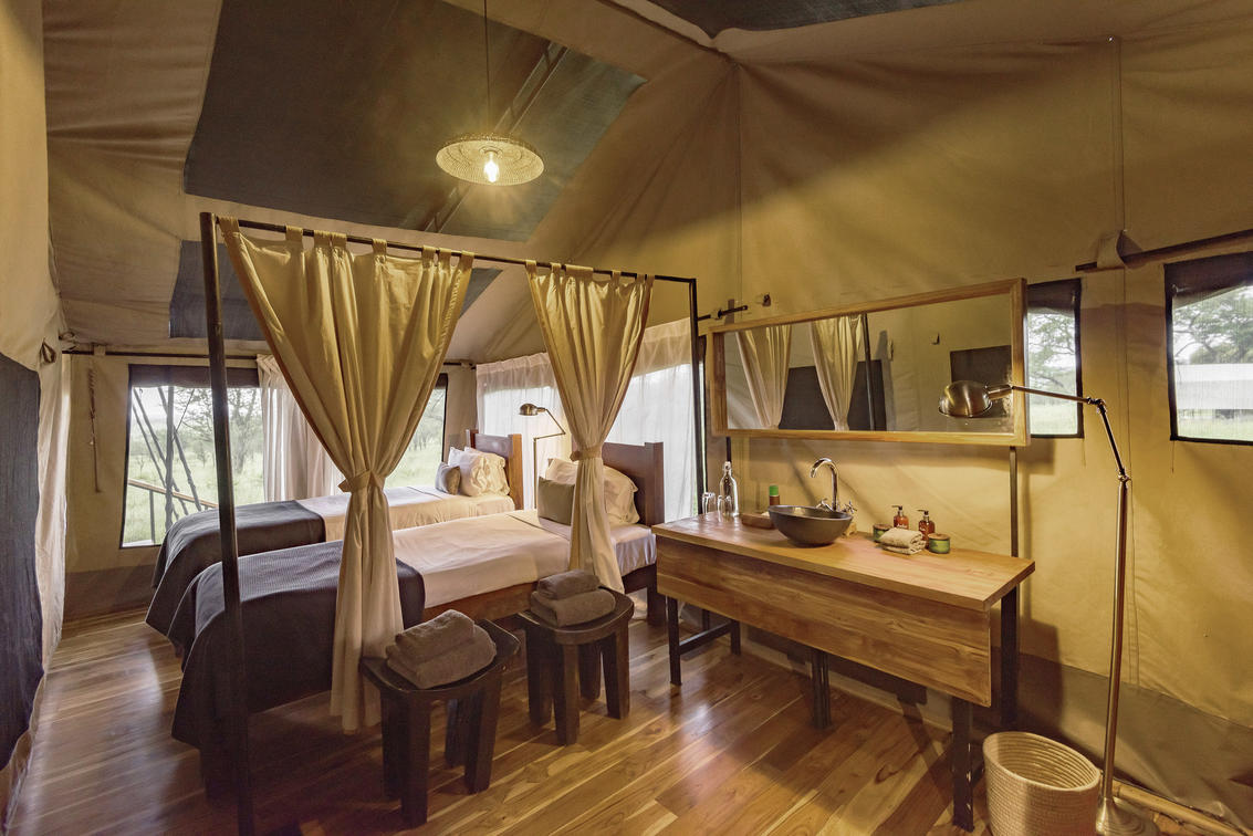 La tienda familiar consta de una habitación principal con una cama king-size y una habitación separada más pequeña con dos camas individuales. Todas las habitaciones disponen de cuarto de baño con inodoro empotrable y ducha de fontanería. Comparten una gran terraza con vistas hacia los kopjes.
