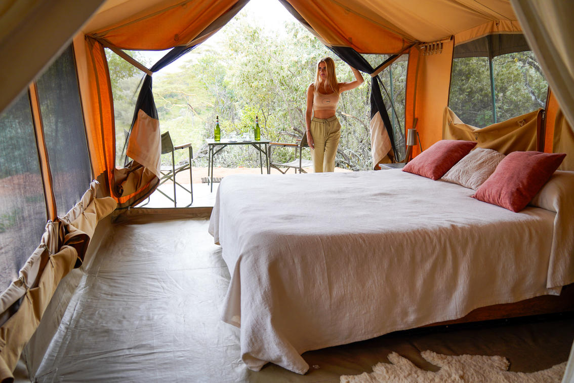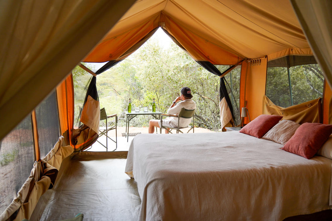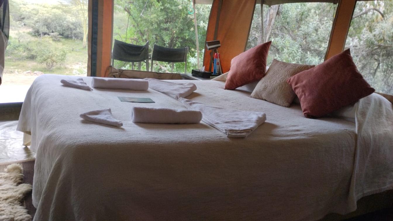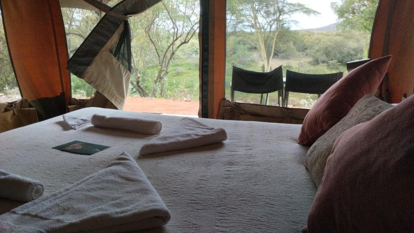 Cada tienda de campaña para huéspedes está cómodamente amueblada con camas, ropa de cama y edredones adecuados. Los baños privados tienen ducha, lavabo e inodoro con cisterna. Las tiendas funcionan con energía solar.
