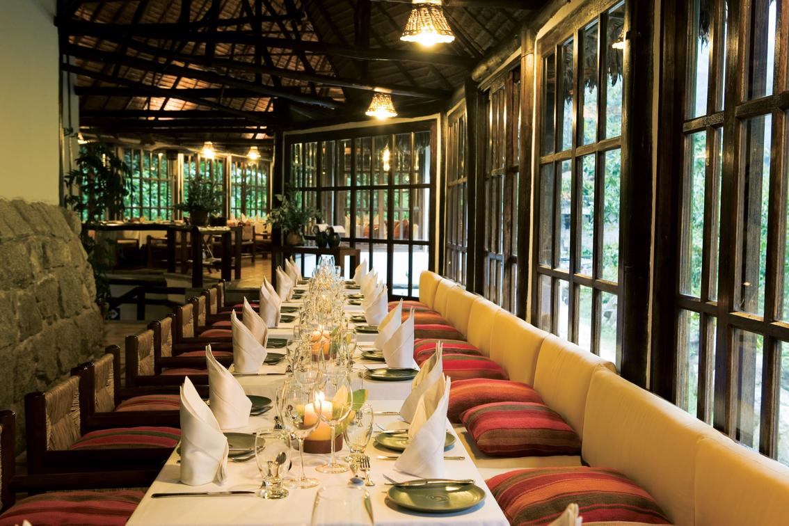 El restaurante y las terrazas adyacentes fueron construidos como una gran casa de cristal con una excepcional vista del Río Vilcanota y de las verdes montañas que la rodean.