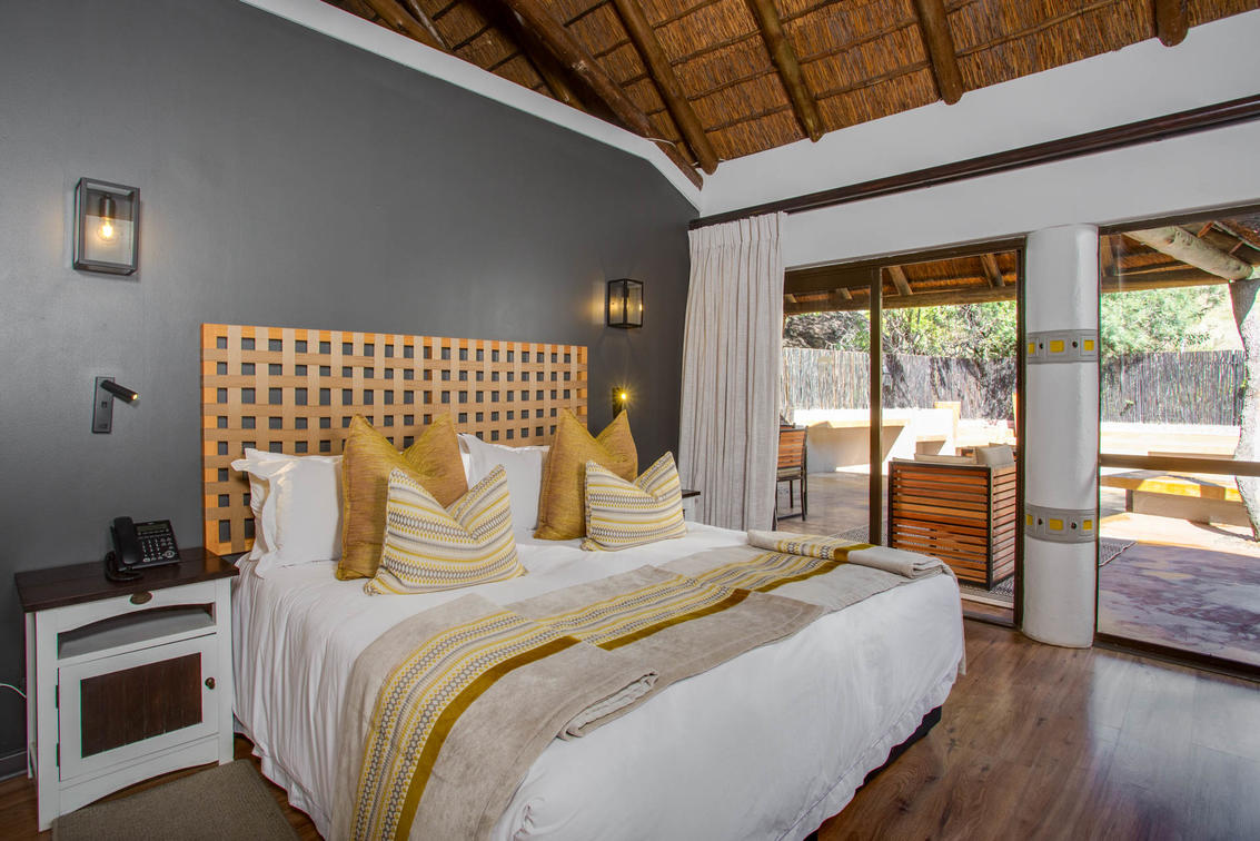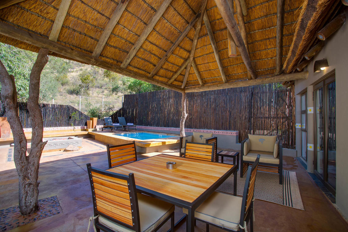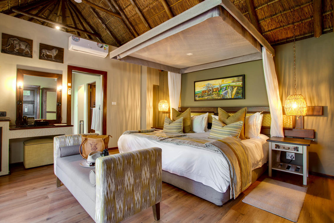 4 suites. Cada una de las cuatro suites de lujo cuenta con una gama de servicios para su comodidad y disfrute, así como una relajante sala de estar al aire libre, una sala de estar con un televisor de pantalla plana y una chimenea para las frías noches de sabana. Todas las suites de lujo ofrecen una piscina profunda privada. Todas estas suites están decoradas con buen gusto con una decoración africana y vienen con una cama doble grande con dosel y un baño privado.