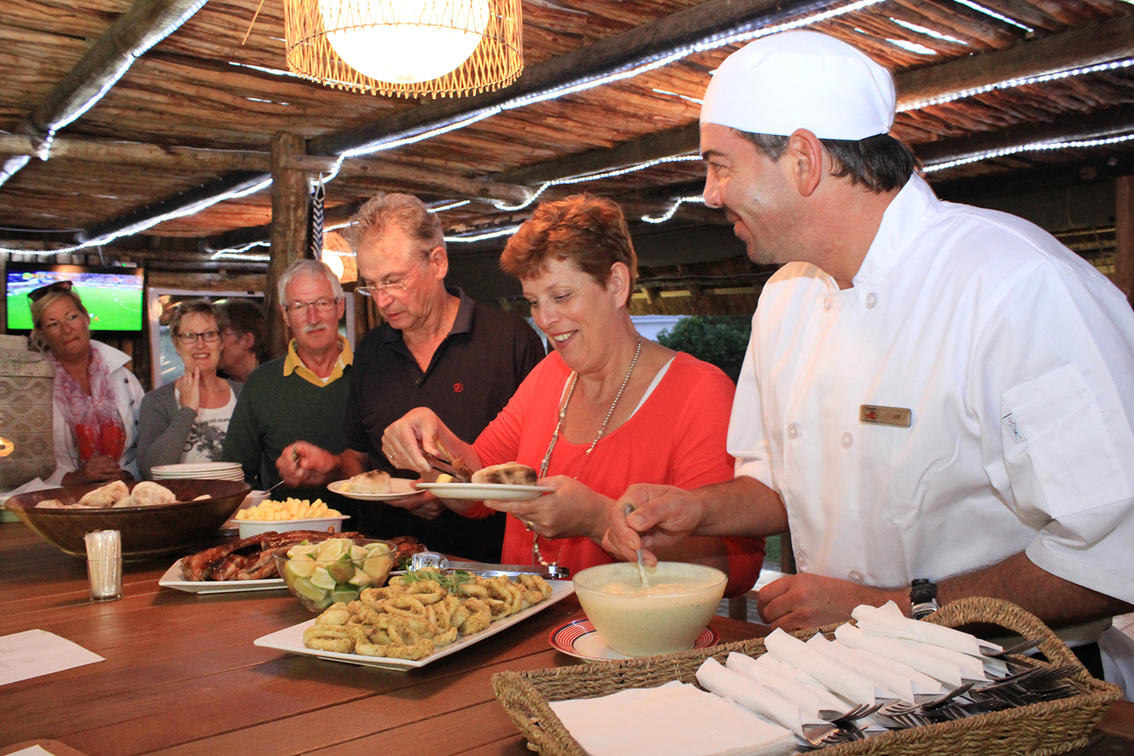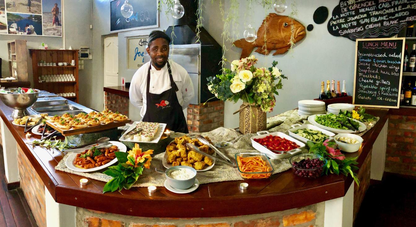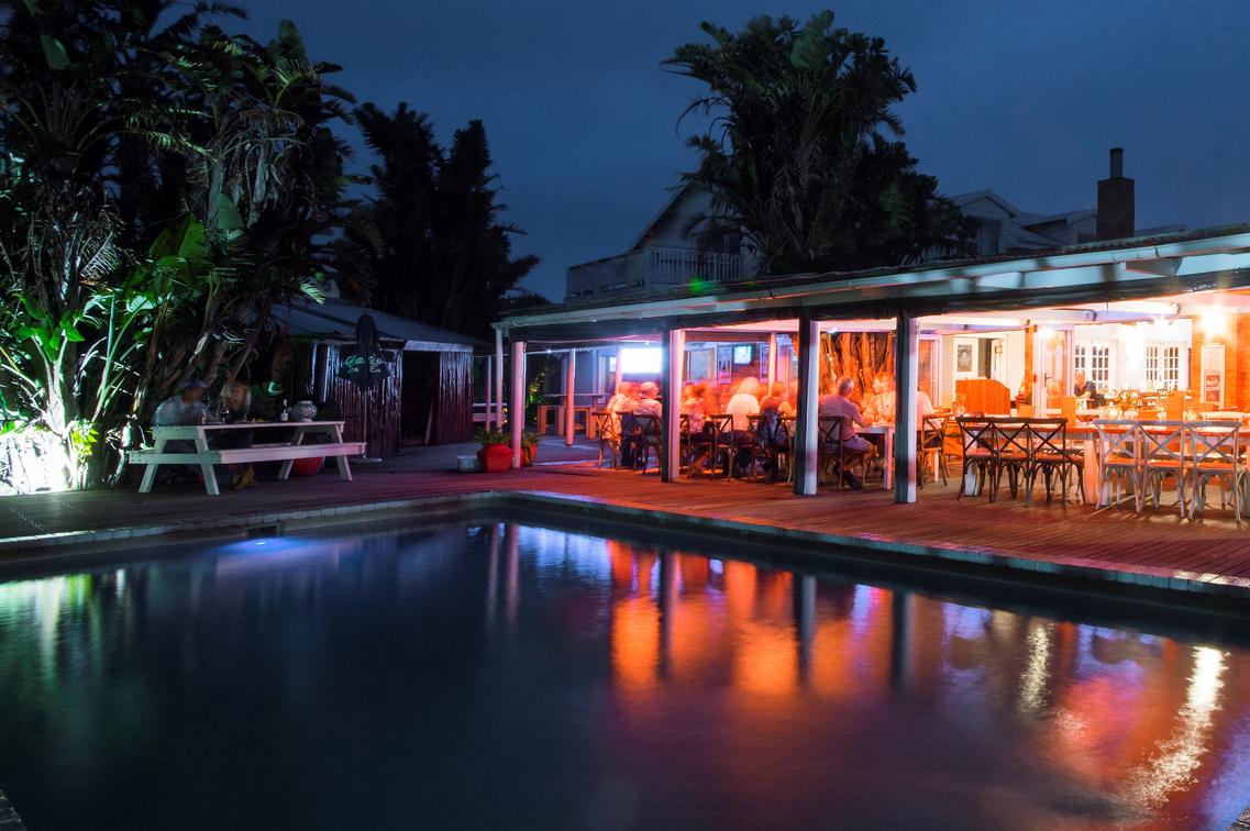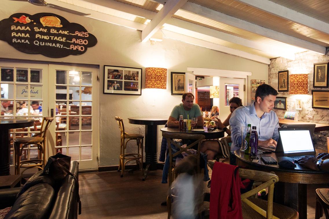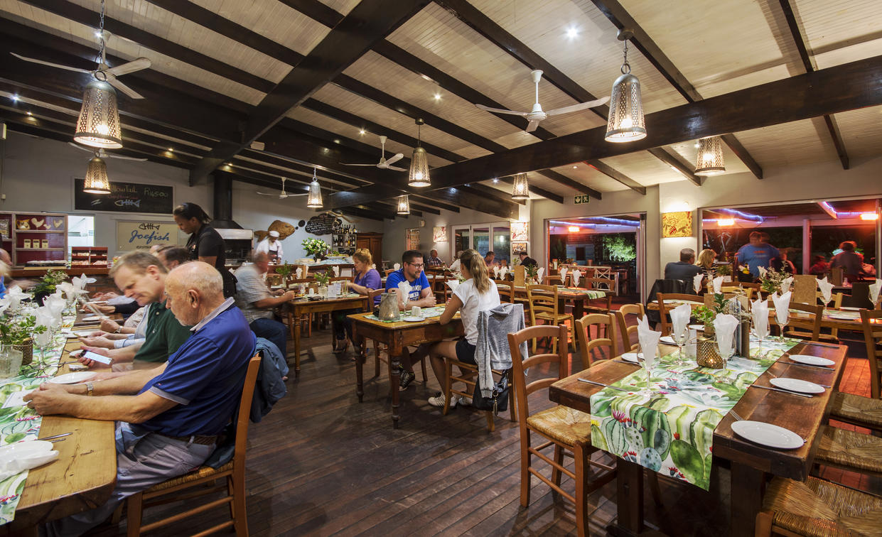 Situado alrededor de la acogedora piscina, el restaurante y bar Joe Fish del Cape St Francis Resort cuenta con capacidad para 110 huéspedes. Los comensales pueden elegir entre una variedad de platos tentadores como los famosos calamares (que ha ganado premios), costillas marinadas, filete perfectamente cocinado, merluza Joe y patatas fritas, y para los más hambrientos ¿por qué no probar el sabroso eisbein crujiente?