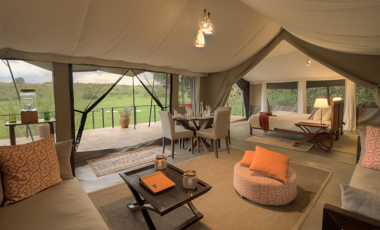 Dos dormitorios separados, cada uno con baño en suite. Las habitaciones están conectadas por una cómoda sala de estar, completa con un sofá y una mesa pequeña que permite comer en privado. La suite tiene capacidad para un máximo de 5 personas y cuenta con un vehículo de uso exclusivo para safaris.