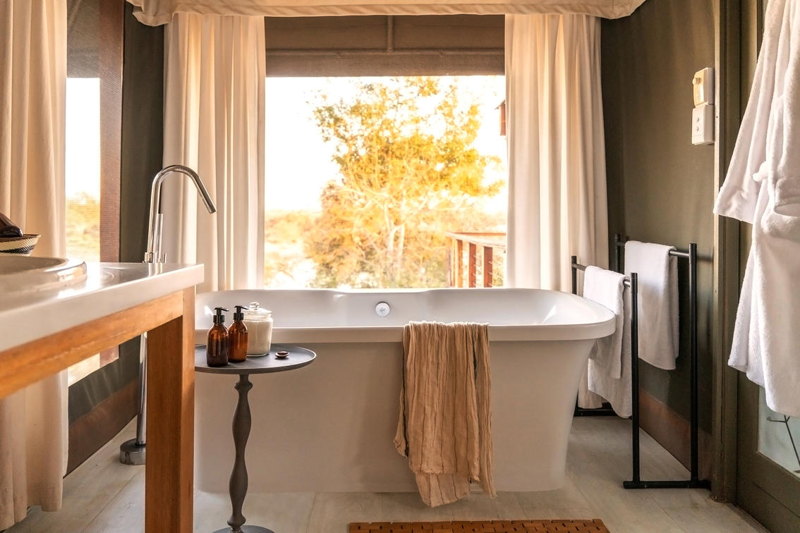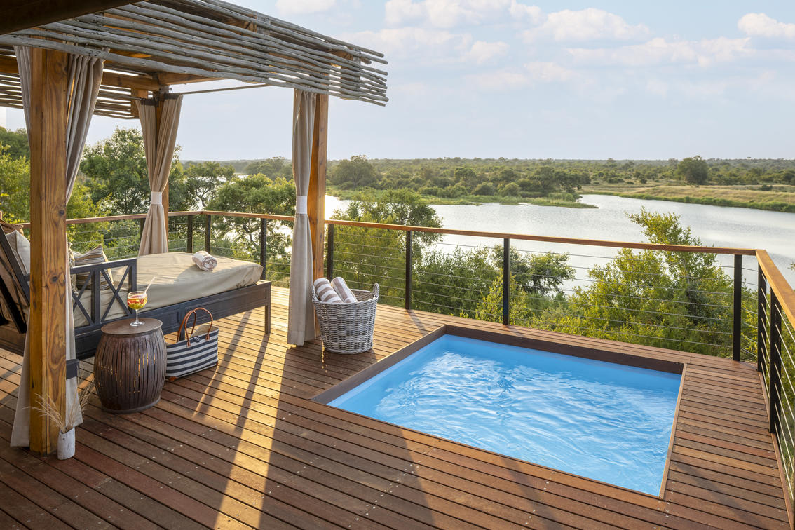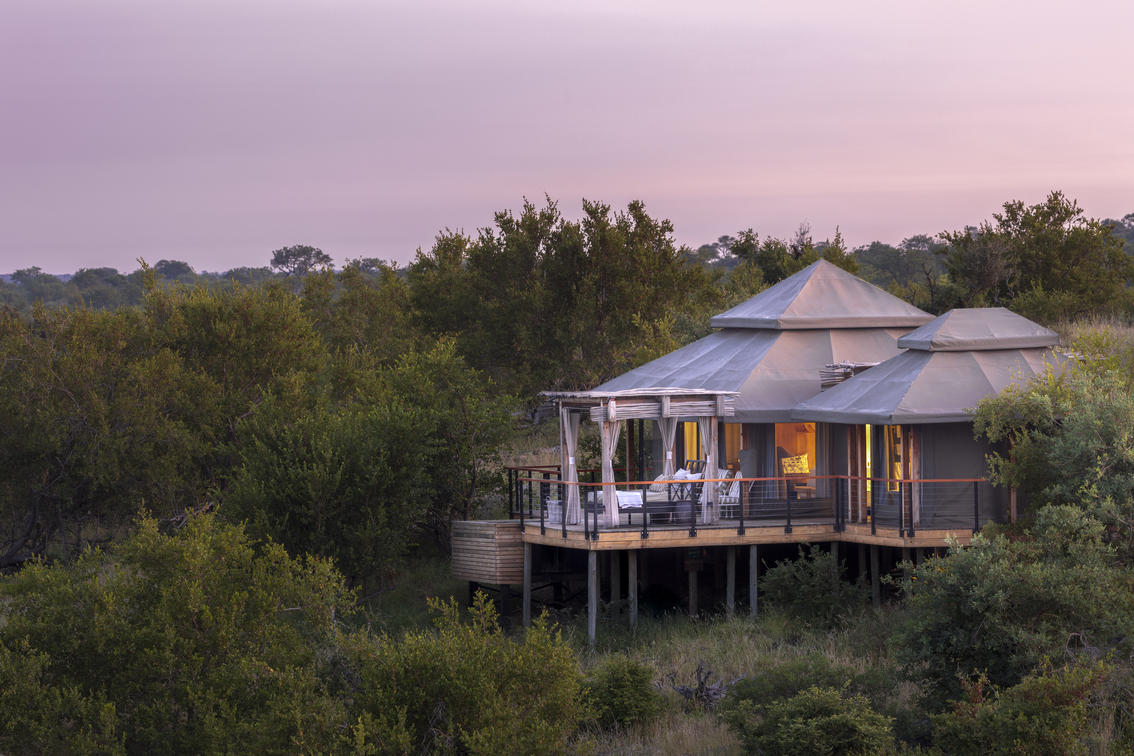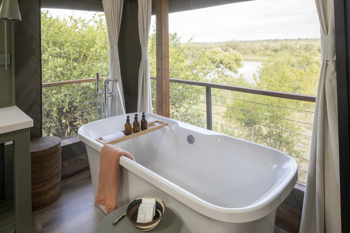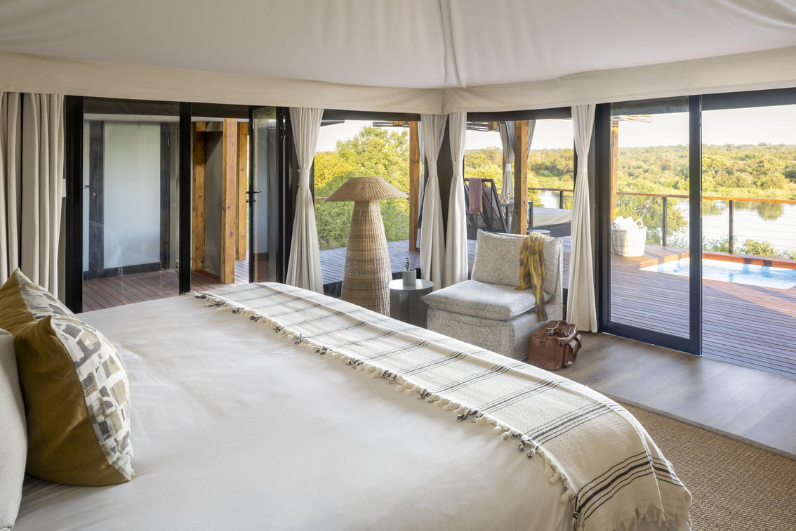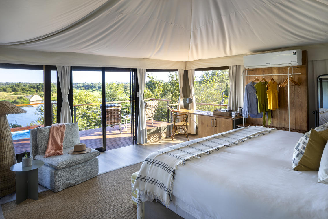 8 lujosas tiendas de campaña ofrecen una opción o cama extragrande o 2 camas individuales. Cada suite tiene vistas magníficas sobre el bushveld, la presa y el río Nhlaralumi. Las puertas francesas se abren a un amplio mirador, cada uno con su propio pabellón privado de sala con cama de día doble para leer o dormir por la tarde.