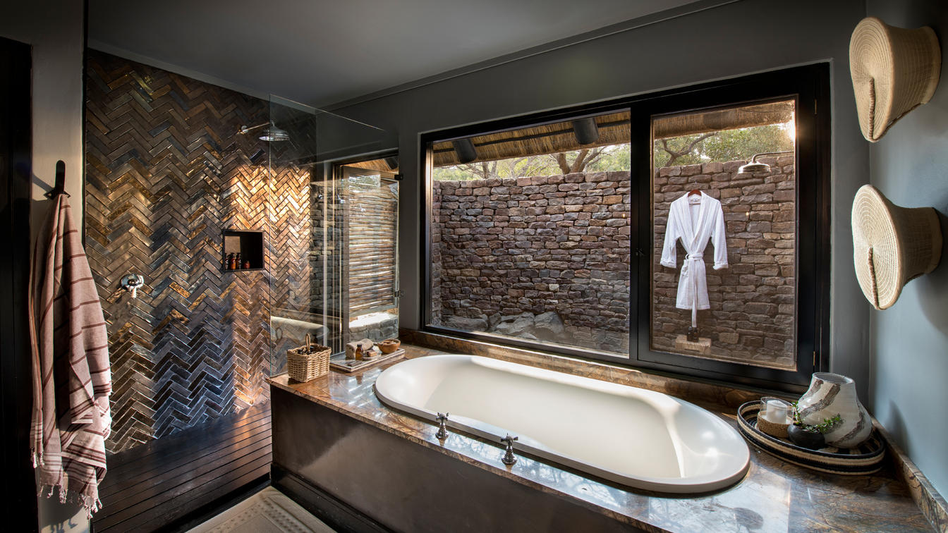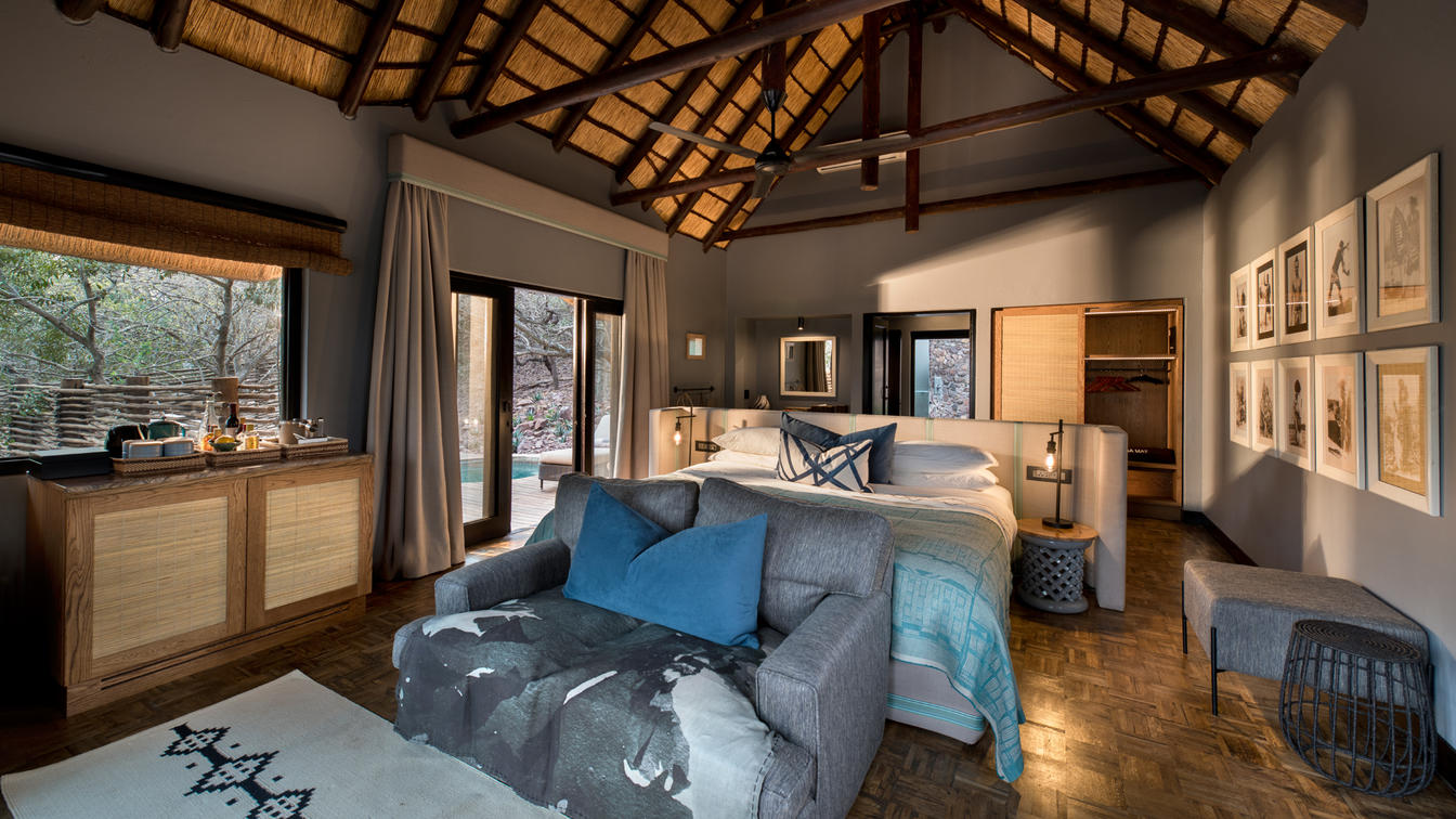 Las seis cabañas de invitados del Phinda Mountain Lodge cuentan con baño elegante, zona de estar privada y porche con piscina de inmersión y ducha al aire libre. Las cabañas son ligeramente más pequeñas que las suites, y cuentan con puertas interconectadas que las convierten en casas familiares.