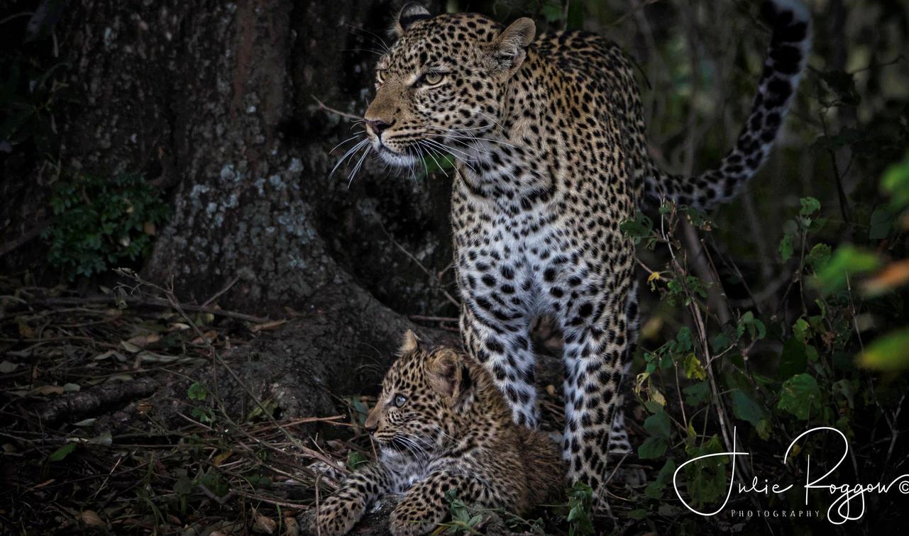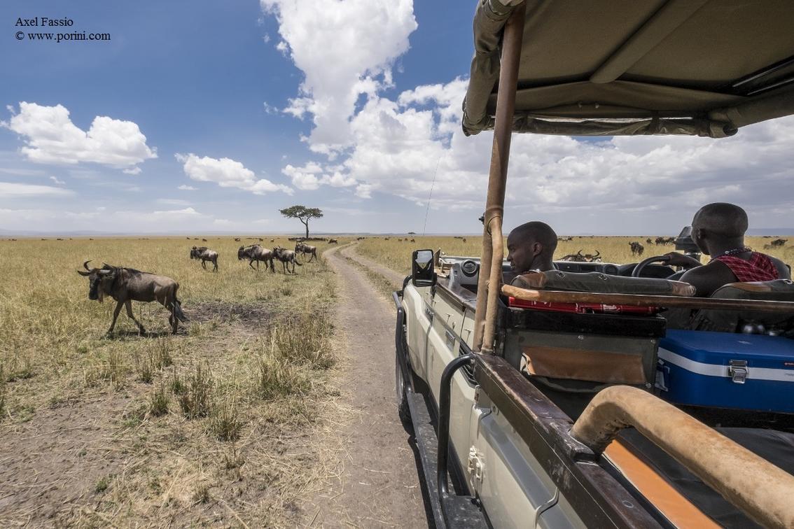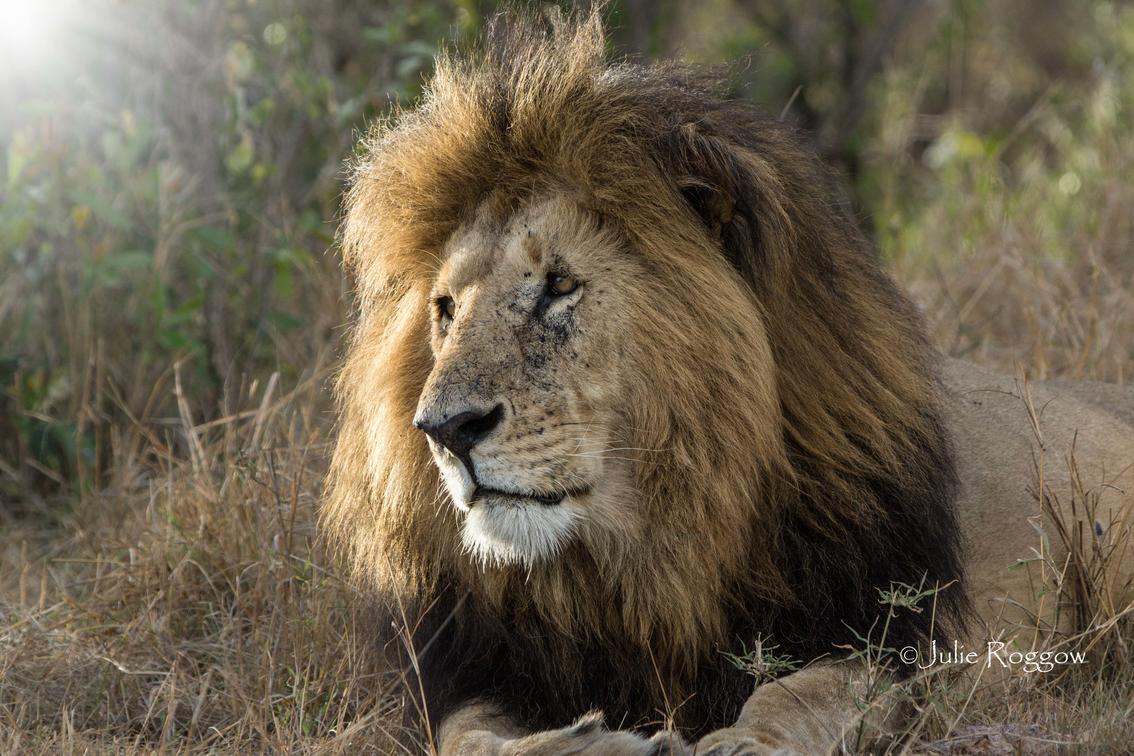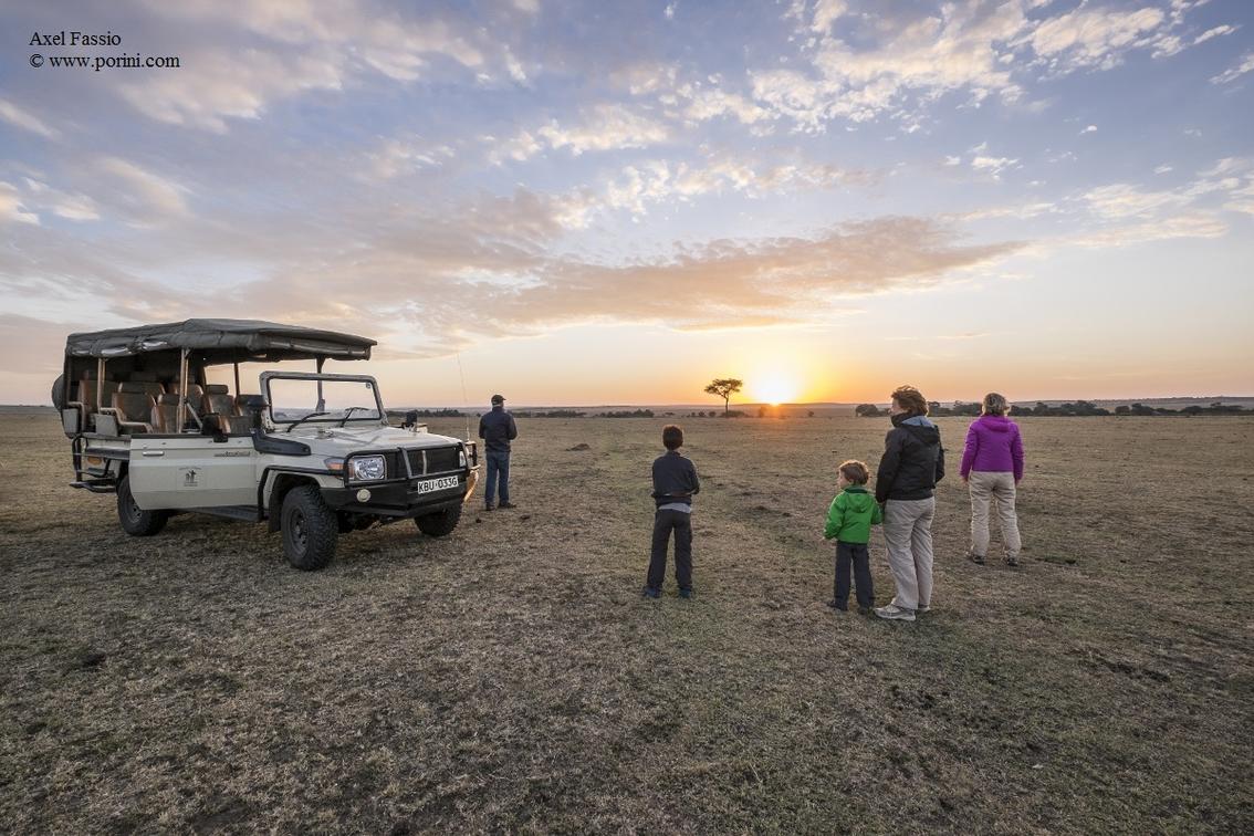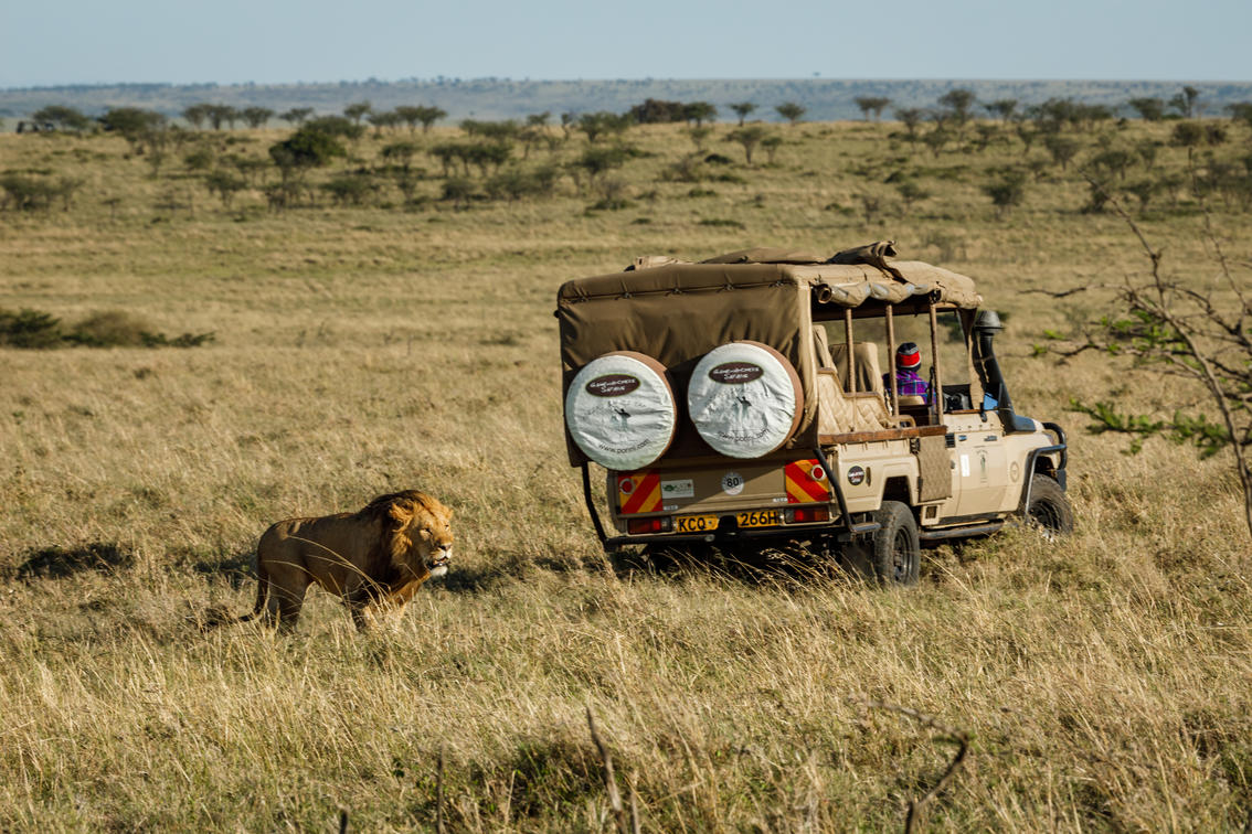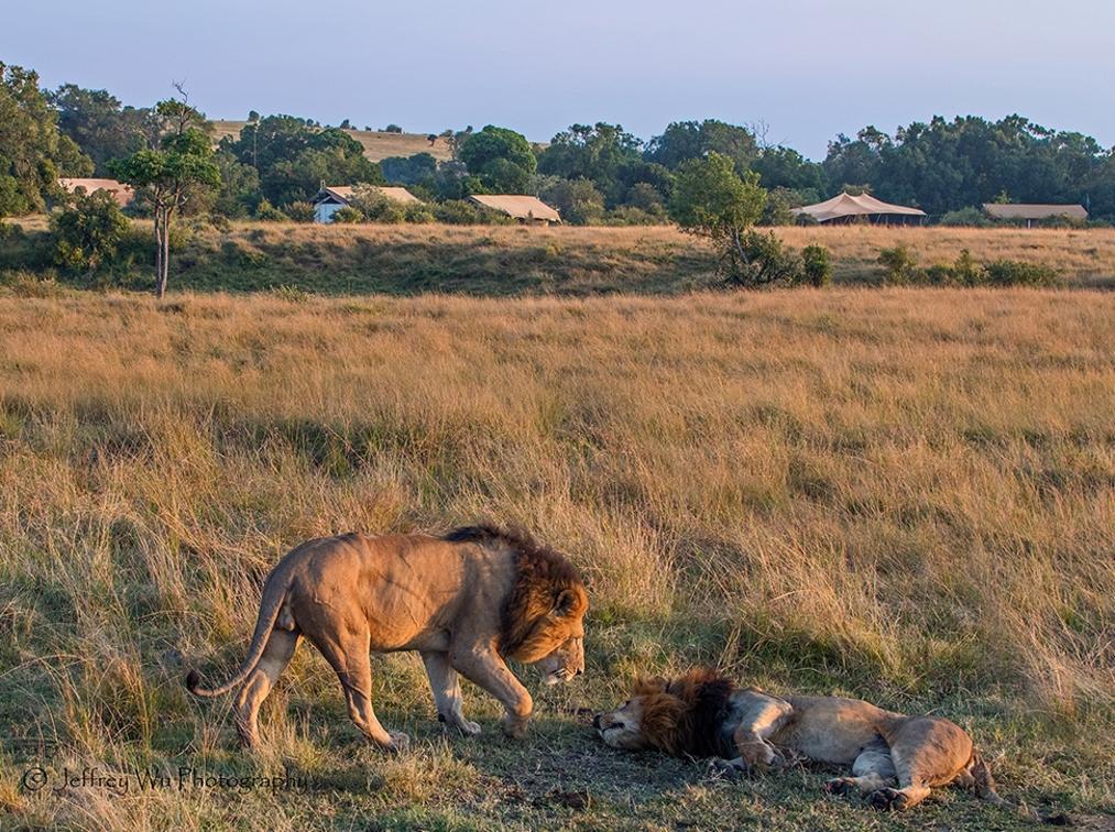 El avistamiento de la unidad de juego desde el campamento de león de Porini