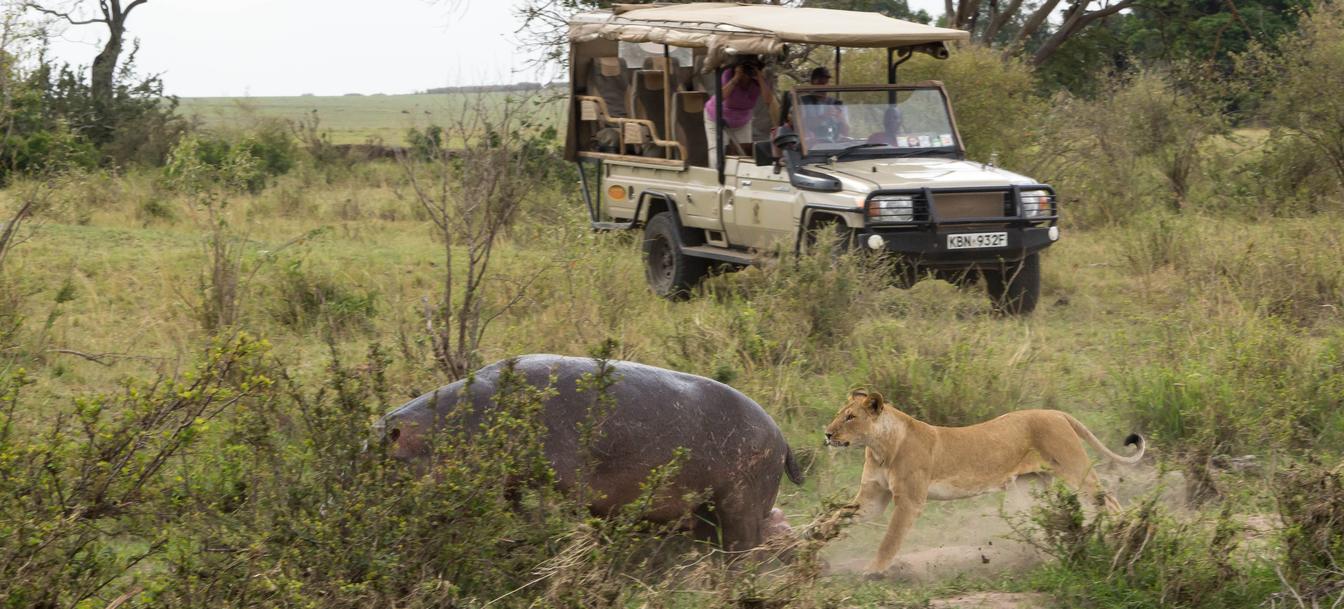 Hipopótamo vs Lion parecen en una unidad de juego de Porini Lion Camp