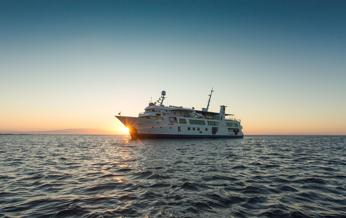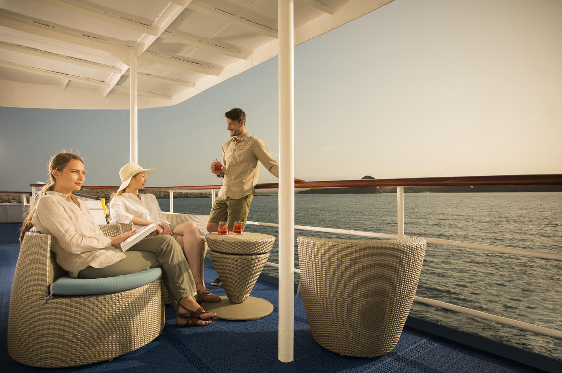 Los huéspedes se relajan con refrescantes bebidas en el solárium del yate Isabela II, disfrutando del cálido resplandor del sol poniente.