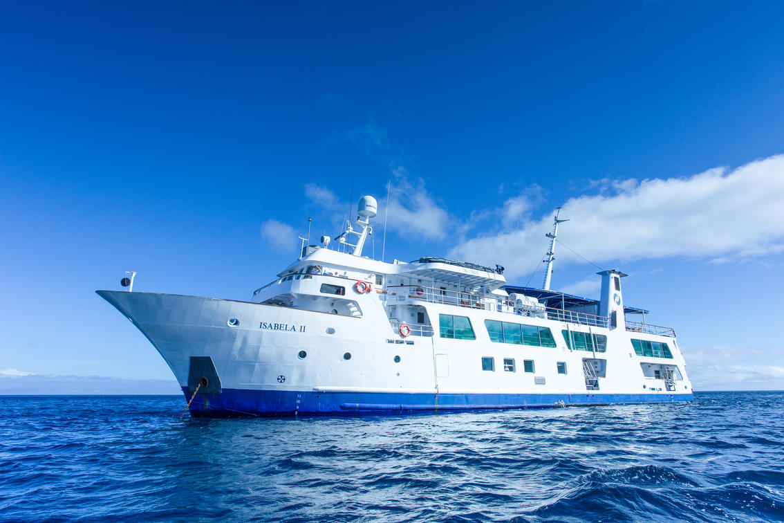 Huéspedes disfrutando del buffet al aire libre en el solárium del yate Isabela II, Galápagos.