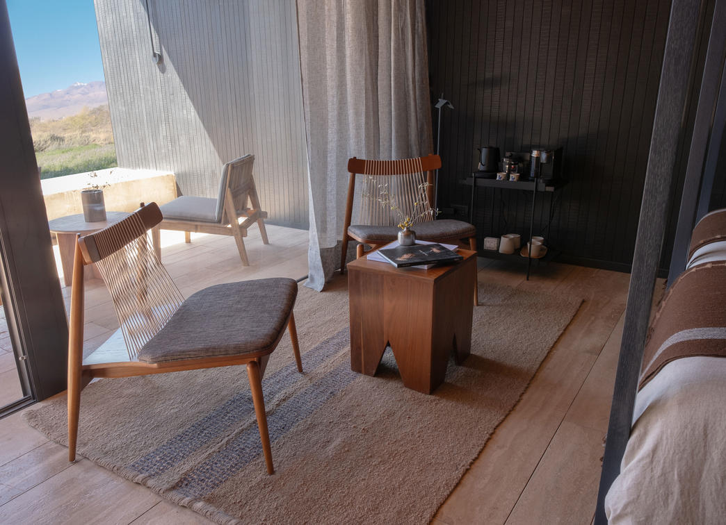 A room with a view: After long days exploring the ethereal landscapes of the Atacama Desert, the Oriente Room is a welcome refuge, designed for quiet reflection and relaxation. Enjoy views of the Licancabur Volcano through expansive sliding glass windows or bask in the desert warmth on the private terrace with mud brick snug.