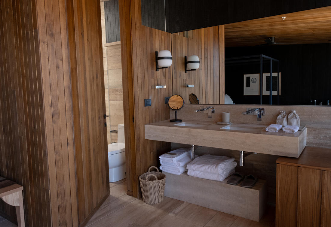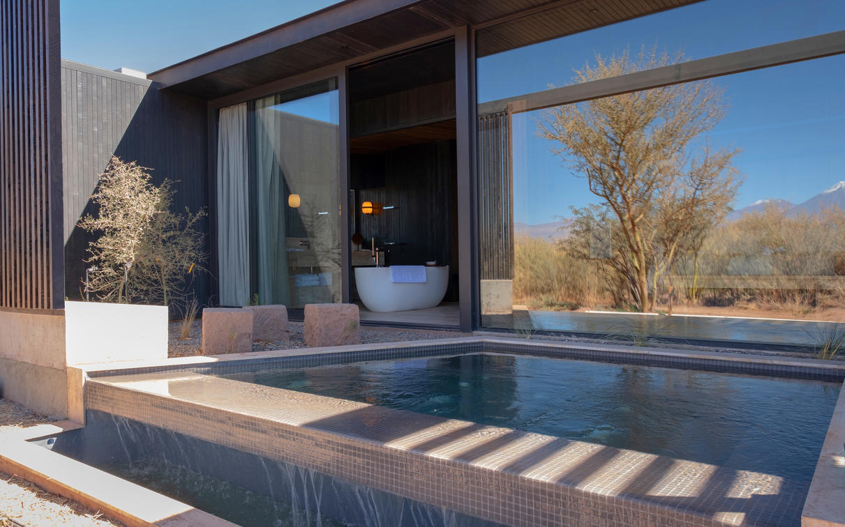Generously spacious, the Poniente Room features a dramatically angled ceiling and towering picture window, flooding the living areas with natural light and framing views of the Licancabur Volcano from dawn till dusk. A slate-clad ensuite features a deep-soak bathtub and an outdoor walk-in rain shower beckons for bathing under the stars.