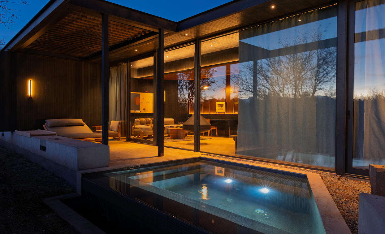 A room with a view: The luxurious Suite invites refuge with warm lenga wood paneling and locally-inspired furnishings throughout.