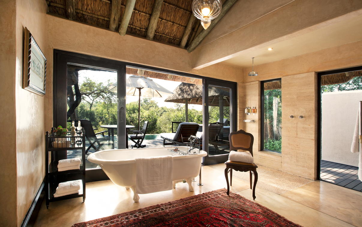 Boasting unparalleled views, Malewane Lodge's six palatial suites are the pinnacle of refinement and opulence in game lodge accommodation. Luxuriously appointed and fully air-conditioned, they provide an elegant old-world style refuge in the heart of the bush. Each room accommodates two guests and enjoys private wooden decks, rim-flow pools and thatched gazebos. Each suite contains a fireplace, beautiful dark wooden furniture and canopied king-size bed. Bathrooms are extravagantly sized, full of light and the epitome of indulgence. Enjoy the huge Victorian-style bath and shower inside or out. Elevated walkways link the rooms to the main lodge. Only the wildlife will witness you relaxing in this ultra-private, ultra-luxurious lodge accommodation.