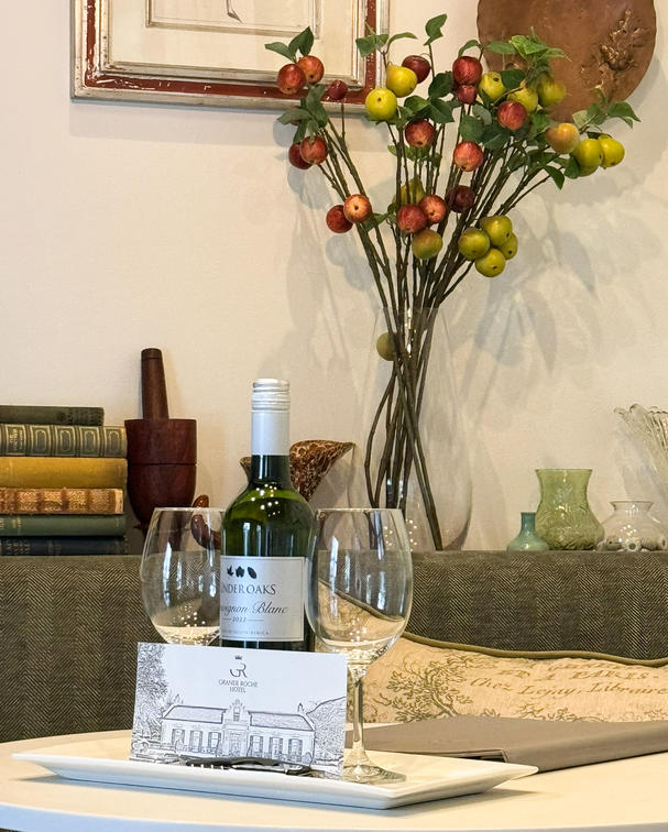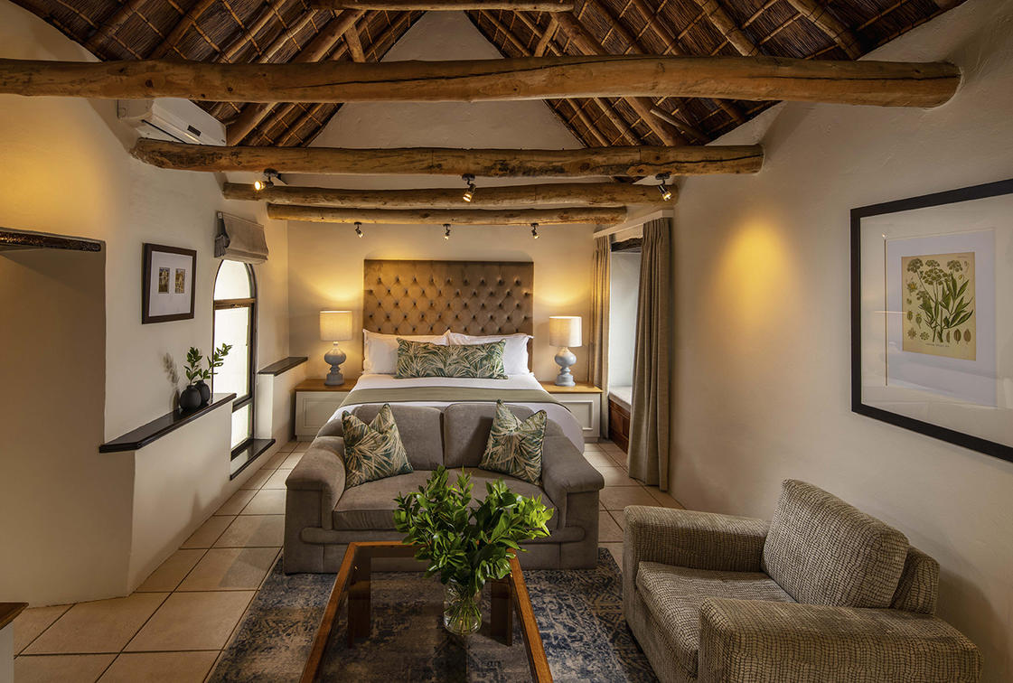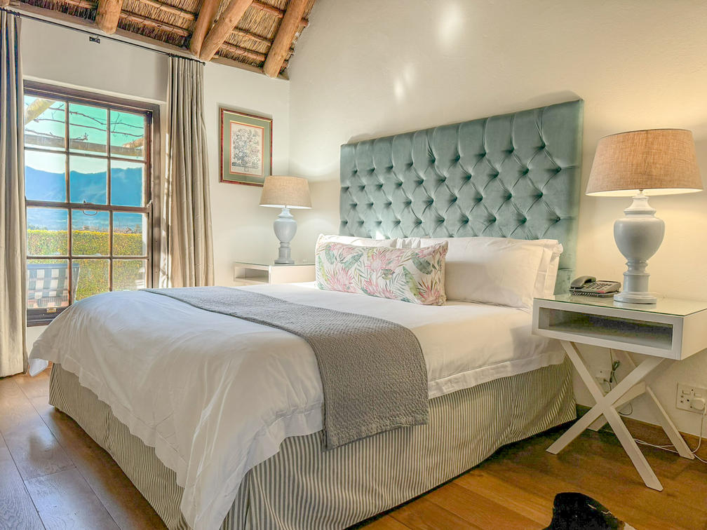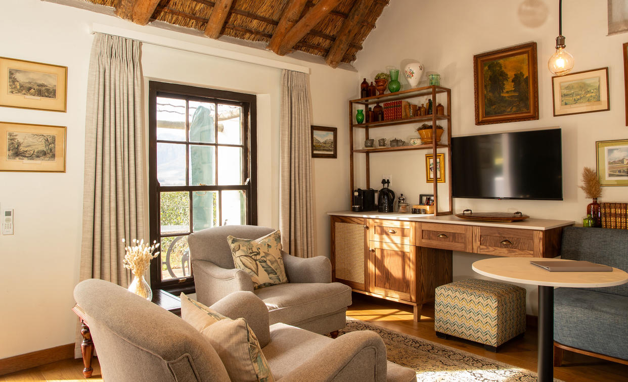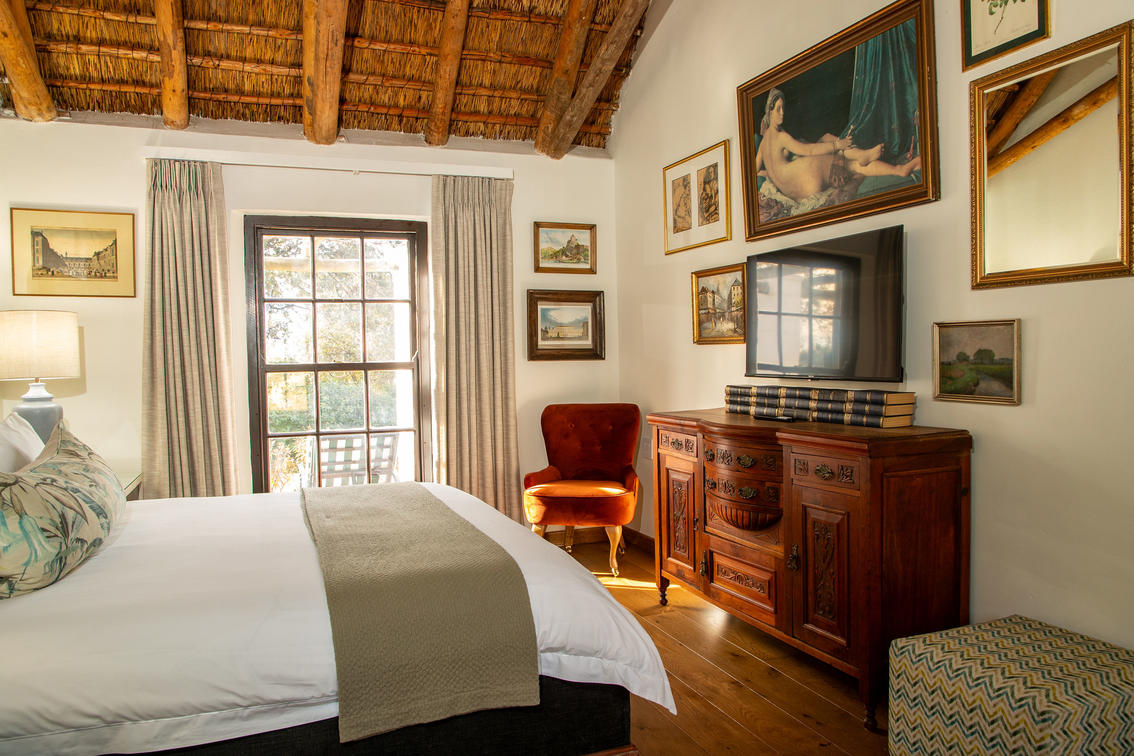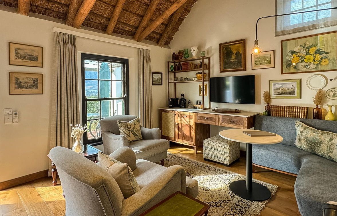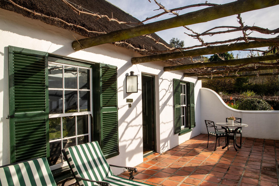 Our 18 terrace suites are in groups of three, scattered around the estate. All are built in the original Cape colonial style, with thatched roofs, shutters and trailing vines over the private outdoor terrace. Whether you are relaxing in the lounge or enjoying a lazy morning in the bedroom, the view from each room is spectacular. Imagine looking out on the mellow mists of autumn or the bright green vines flanked by roses in the summer, this is the place to be whatever the season.