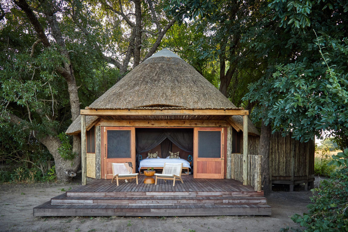 Six simple, thatched, raised rondavels set on the edge of a grassy plain, surrounded by the seemingly out-of-place palm trees. All rooms have convertible beds with a huge canopy of mosquito net, all with unique en suite bathrooms, open to the stars above, with double vanities, shower and a view looking out across the plains . The rooms have panoramic views and open up onto a wooden deck where you can look out onto the surrounding plains and the incredible game that frequently saunters through camp, day and night. Offering exclusive, personalized service and tranquility for no more than 12 guests this is a truly authentic African Safari camp. Kuyenda is open from June to November.