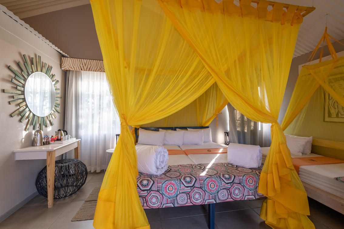 Les chambres sont nichées entre les arbres Mopanes. Elles sont équipées d'un lit double superposé, d'une salle de bain (douche), d'un climatiseur et d'une petite véranda.