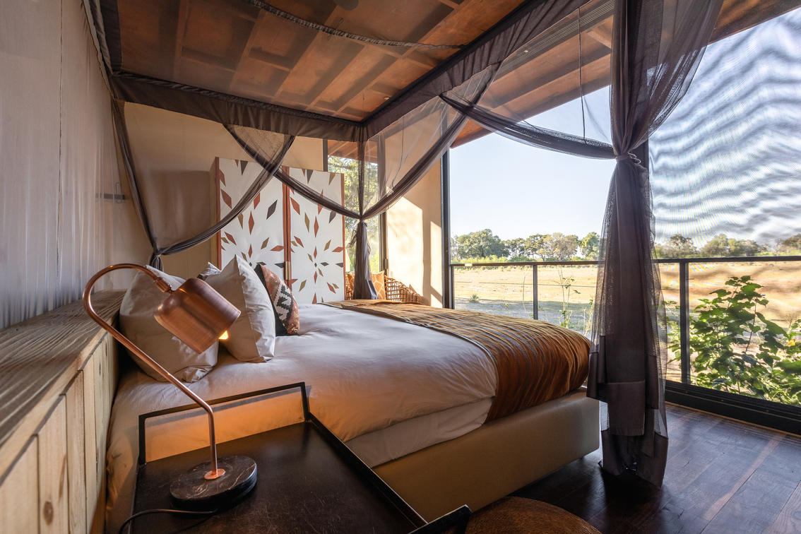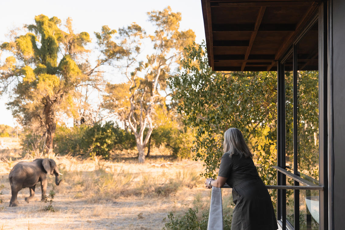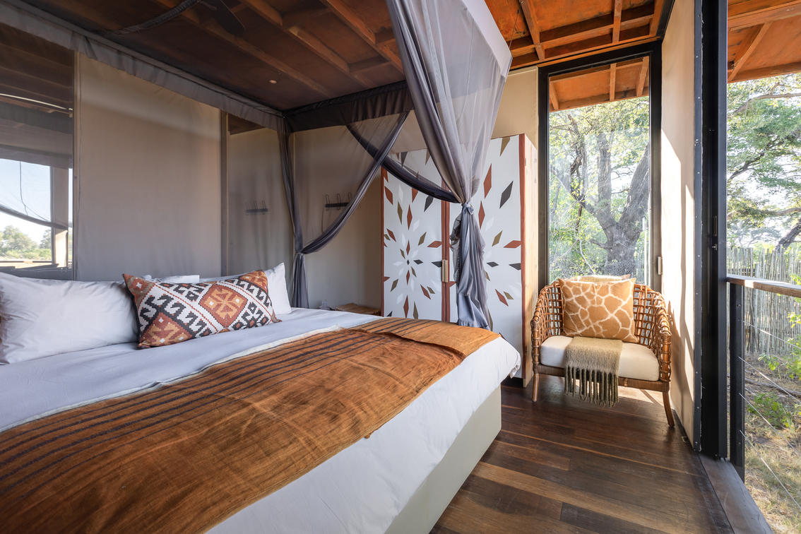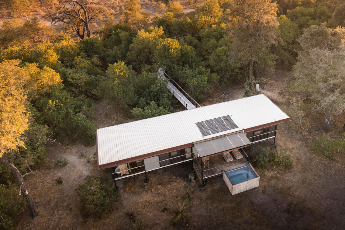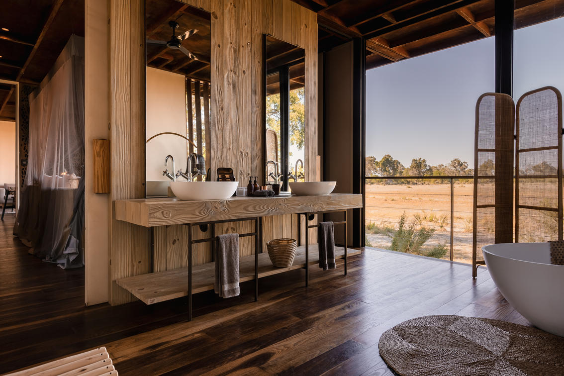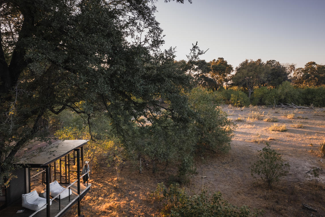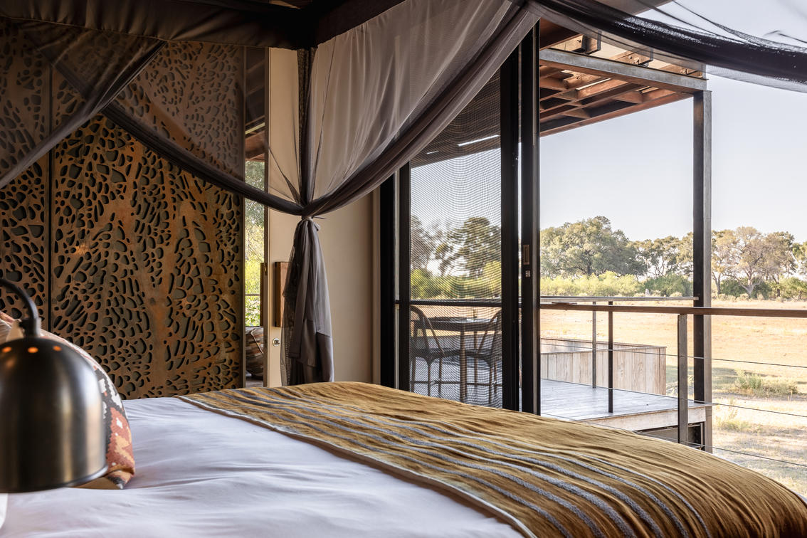 Le design du camp s'inspire de son cadre naturel dans ce paysage extraordinaire du Botswana. Le résultat est un riche mélange de matériaux naturels et de couleurs sur l'ensemble du produit. Du bois blanchi, des taches plus foncées et des accents de rouille et d'orange brûlé sont utilisés partout. Les matériaux choisis pour construire le camp incluent des cadres en acier avec des panneaux de remplissage pour isoler du chaud et du froid, ainsi que des terrasses en toile et en bois. Les plafonds en bois détaillés et perforés de lumière imitent l'expérience d'être sous les arbres au bord du lagon, créant ainsi une union visuelle avec son magnifique environnement.