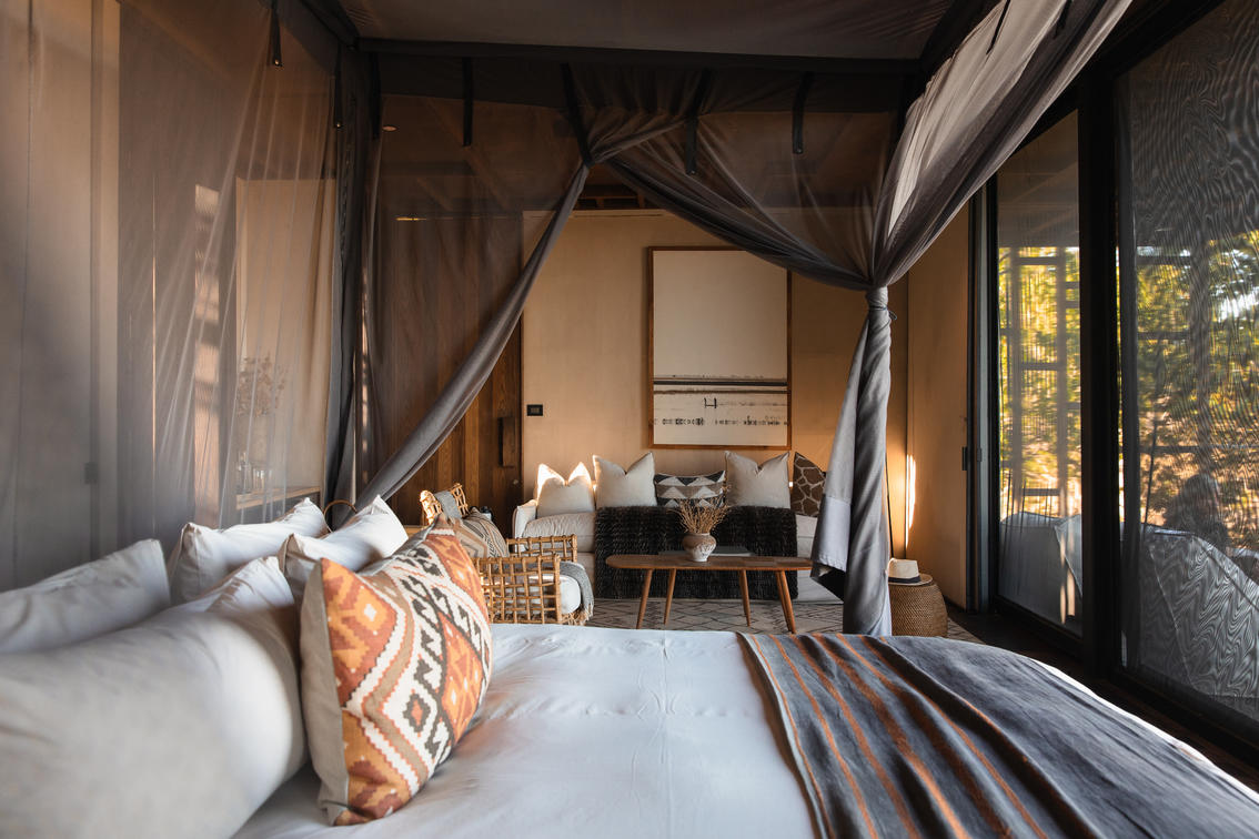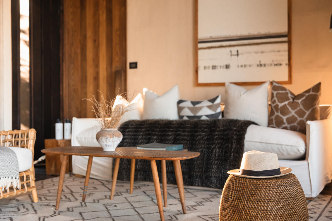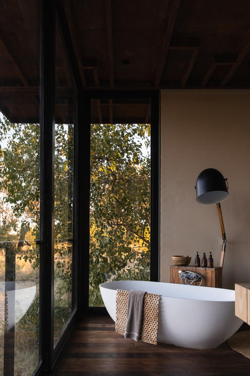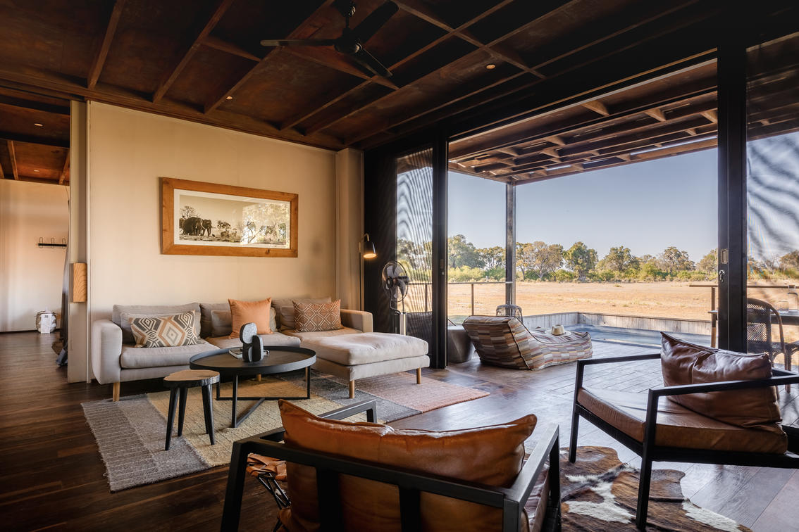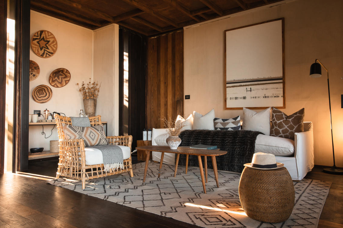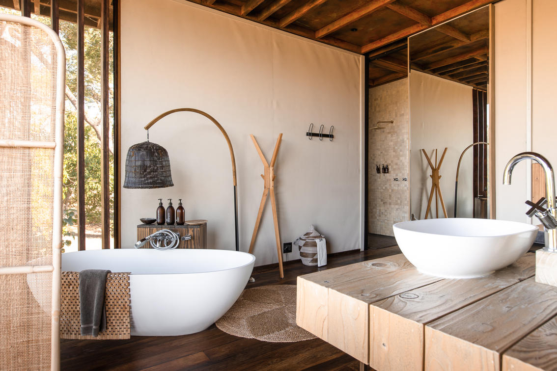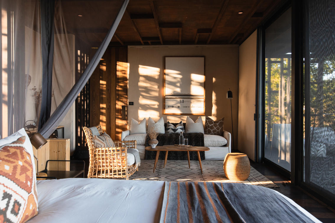 Le design du camp s'inspire de son cadre naturel dans ce paysage extraordinaire du Botswana. Le résultat est un riche mélange de matériaux naturels et de couleurs sur l'ensemble du produit. Du bois blanchi, des taches plus foncées et des accents de rouille et d'orange brûlé sont utilisés partout. Les matériaux choisis pour construire le camp incluent des cadres en acier avec des panneaux de remplissage pour isoler du chaud et du froid, ainsi que des terrasses en toile et en bois. Les plafonds en bois détaillés et perforés de lumière imitent l'expérience d'être sous les arbres au bord du lagon, créant ainsi une union visuelle avec son magnifique environnement.