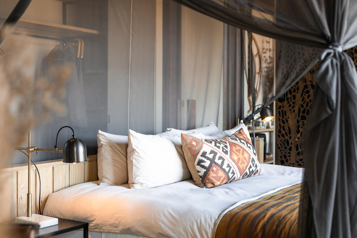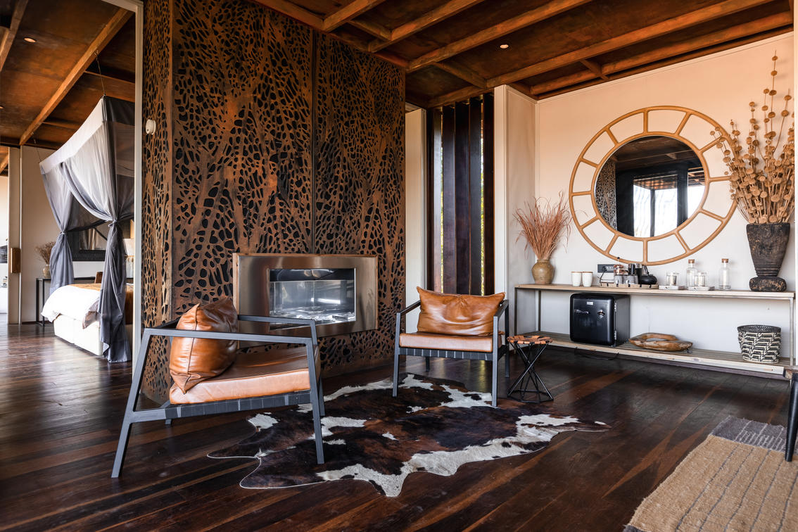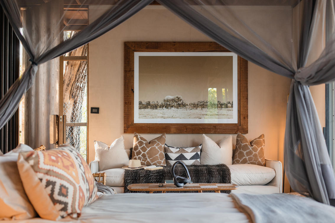 Le Qorokwe possède une tente familiale très spacieuse avec sa propre piscine privée et une terrasse extérieure avec des chaises longues ombragées, ainsi qu'un salon intérieur, un coin repas et une cheminée communs. La chambre principale dispose d'une baignoire intérieure.