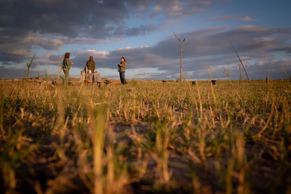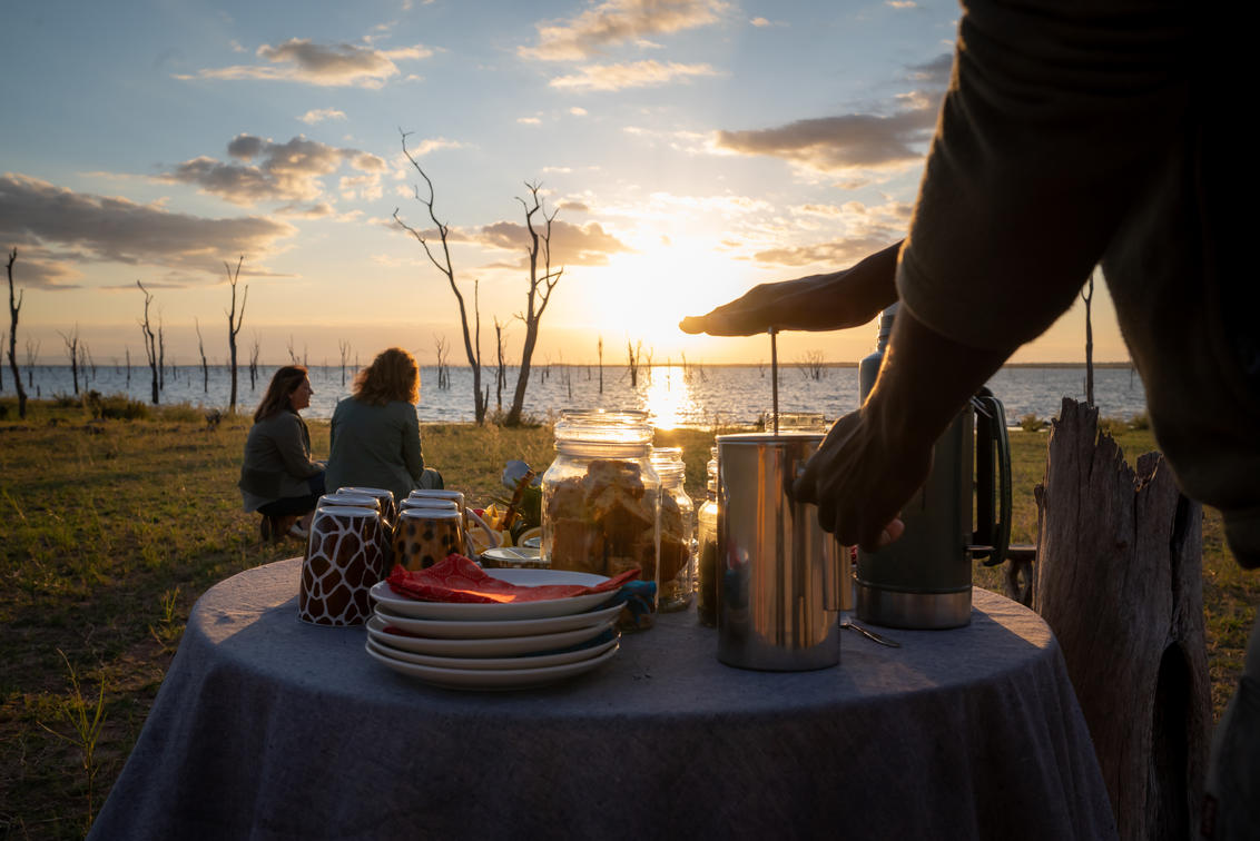 Avec une boisson fraîche à la main, les clients peuvent profiter du moment magique d'un véritable coucher de soleil africain, une tradition de safari séculaire. Observez les hippopotames émerger, les éléphants se promener et les oiseaux s'installer dans les arbres, tout en admirant les couleurs du coucher de soleil sur le lac.