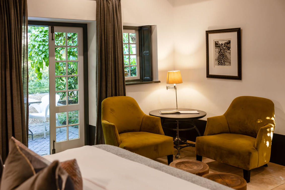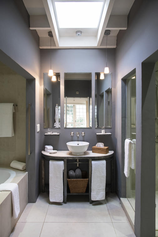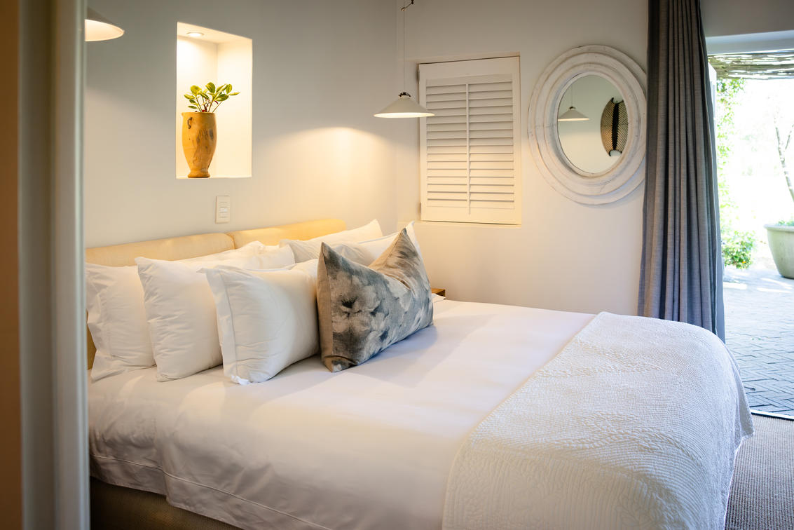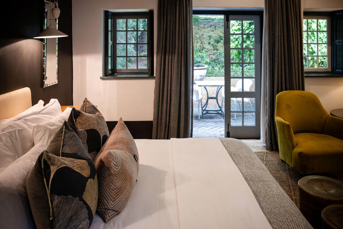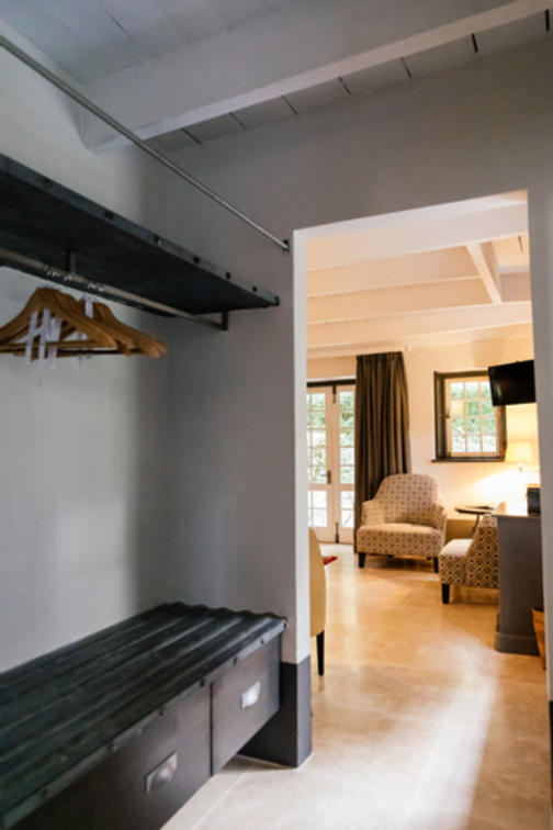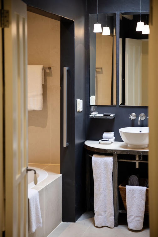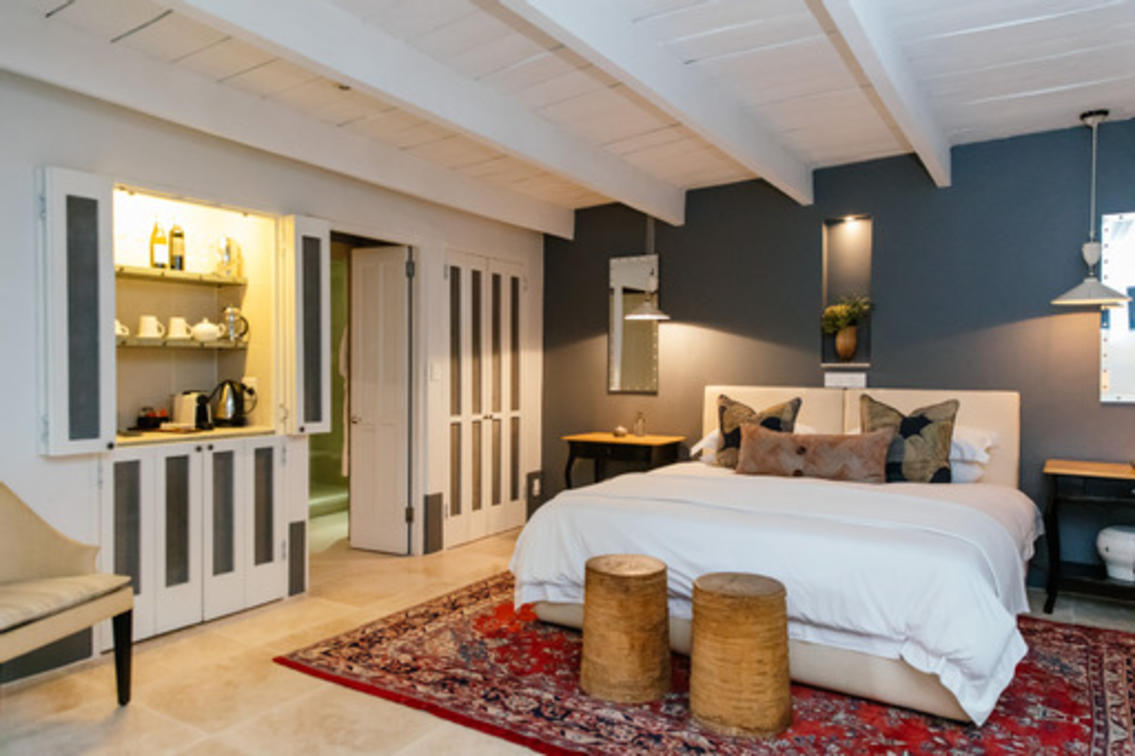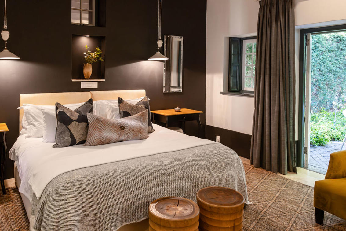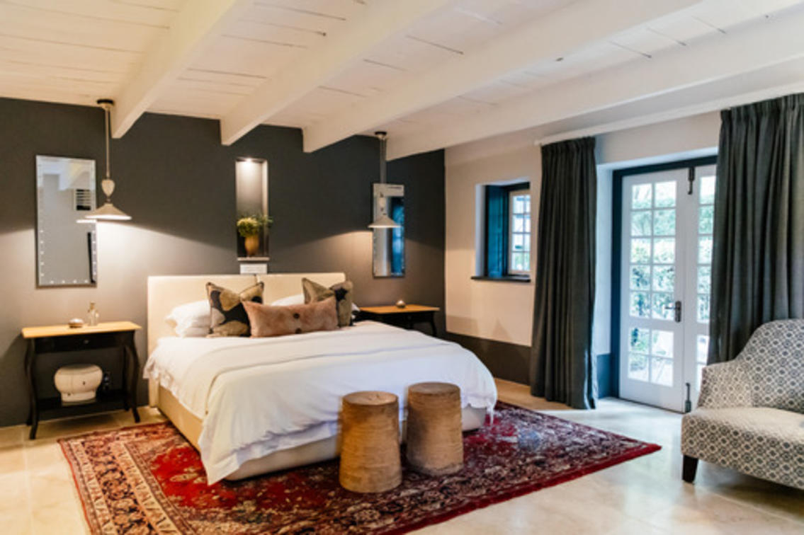 Chambre chic et industrielle au rez-de-chaussée, salle de bains privative luxueuse et spacieuse et articles de toilette. Il s'ouvre sur un patio privé dans le jardin. Lits king/lits jumeaux, linge de maison en percale 400 fils, éclairage tamisé (taille de la chambre : 43 mètres carrés). (Possibilité de réserver l'intégralité du cottage des propriétaires sur la base d'une utilisation exclusive ou en chambre d'hôtes - contactez ownerscottage@grandeprovence.co.za)