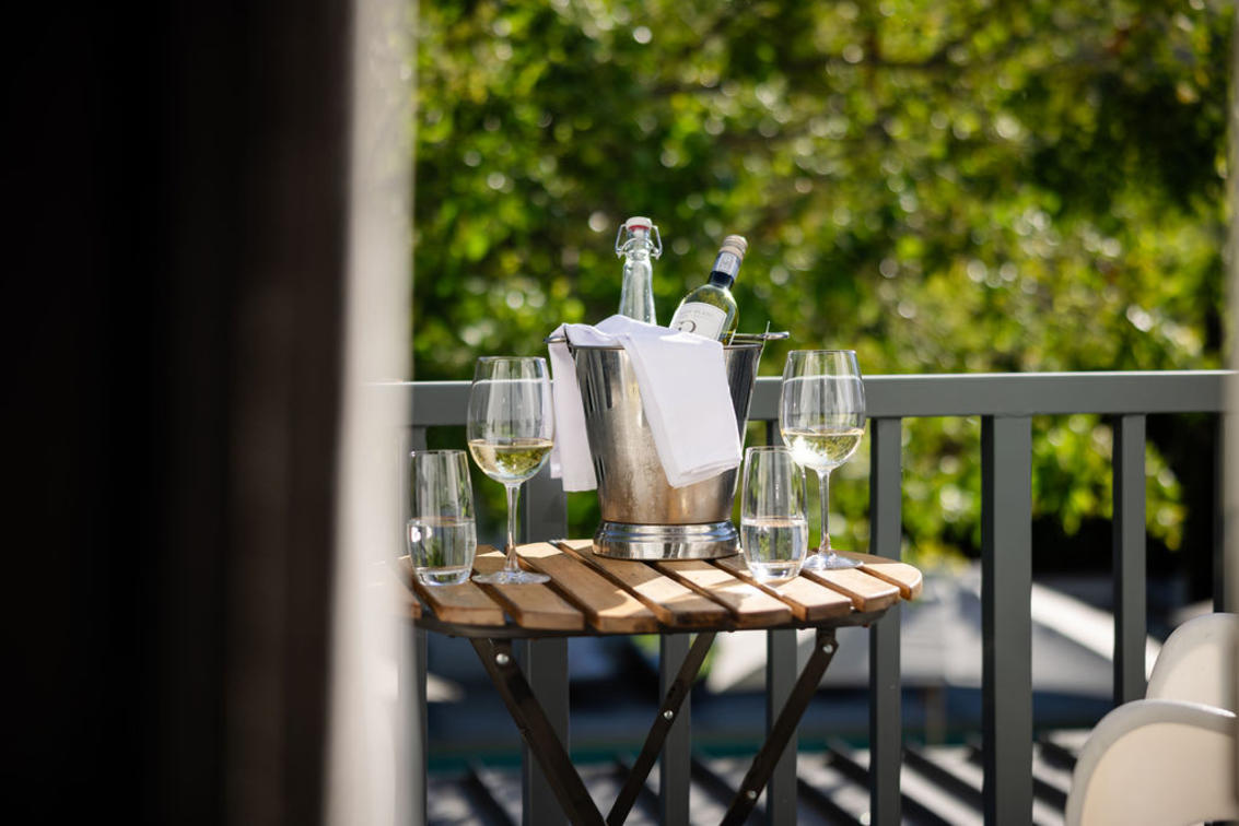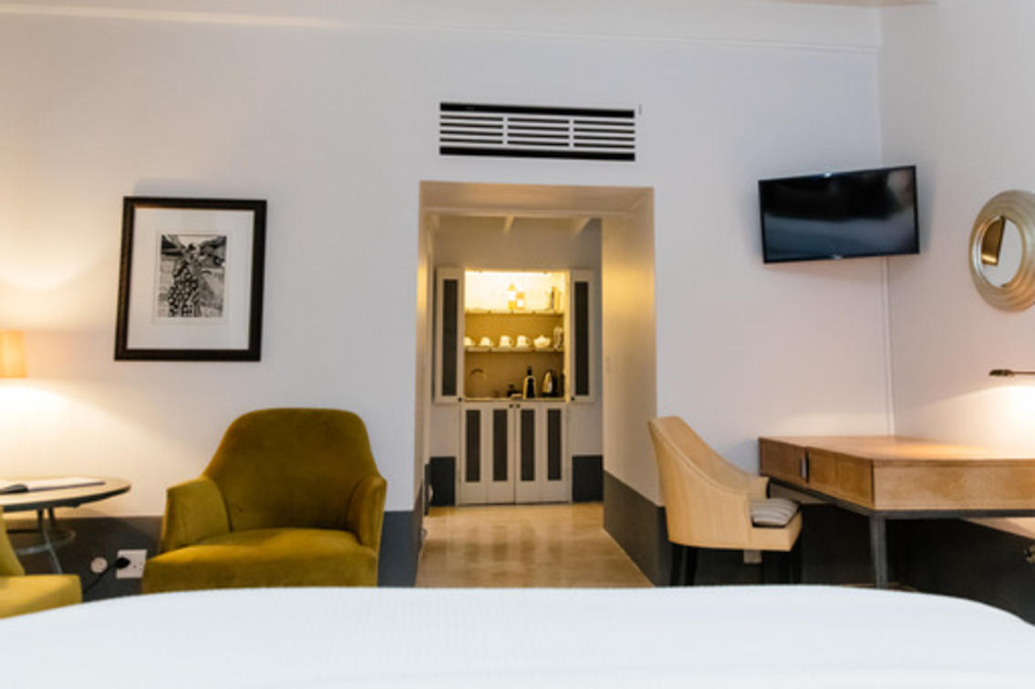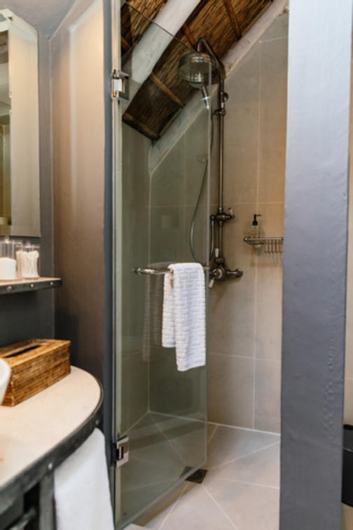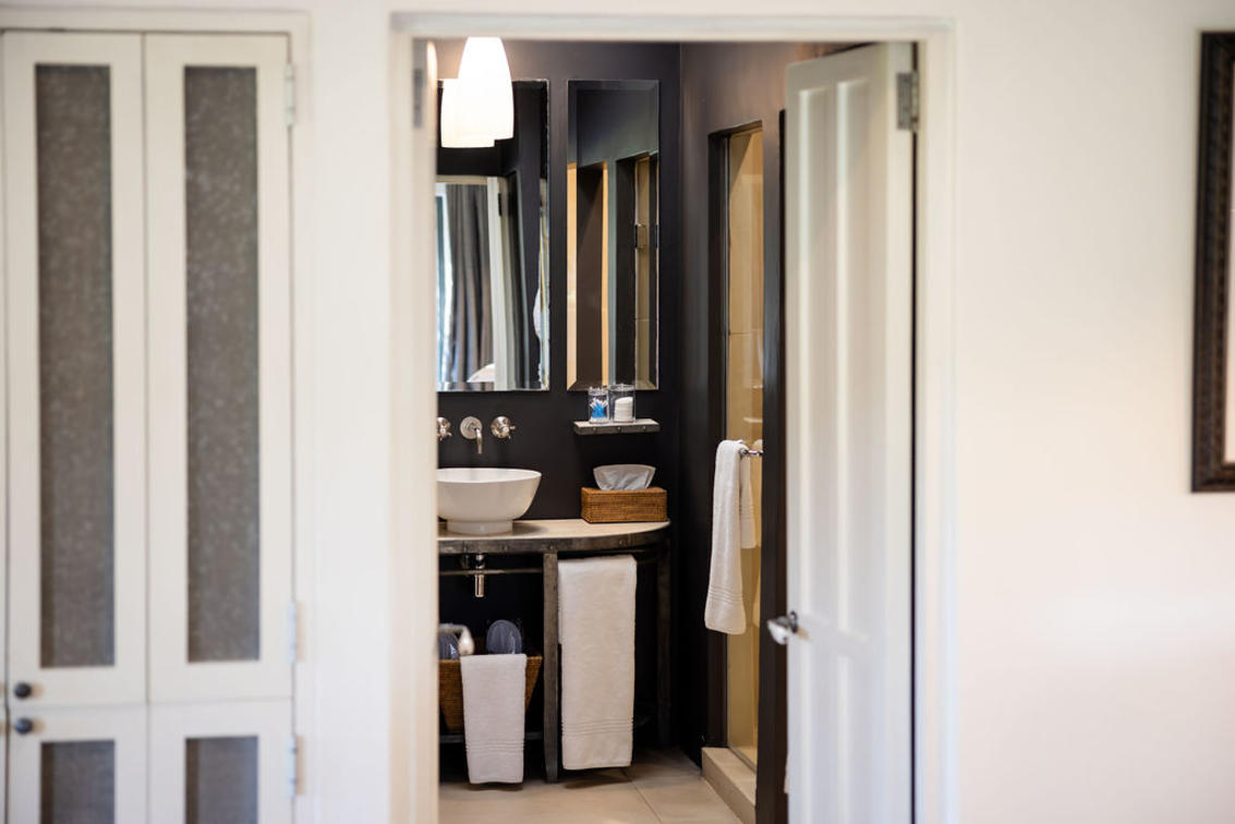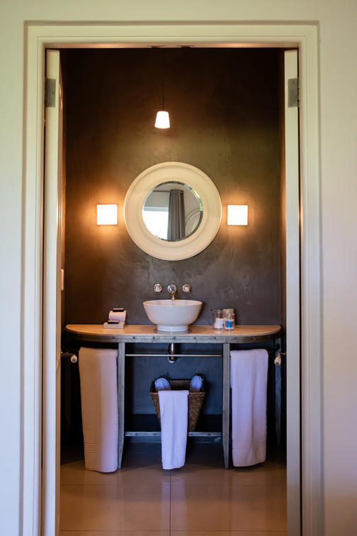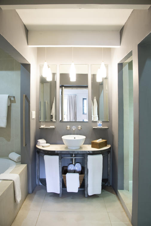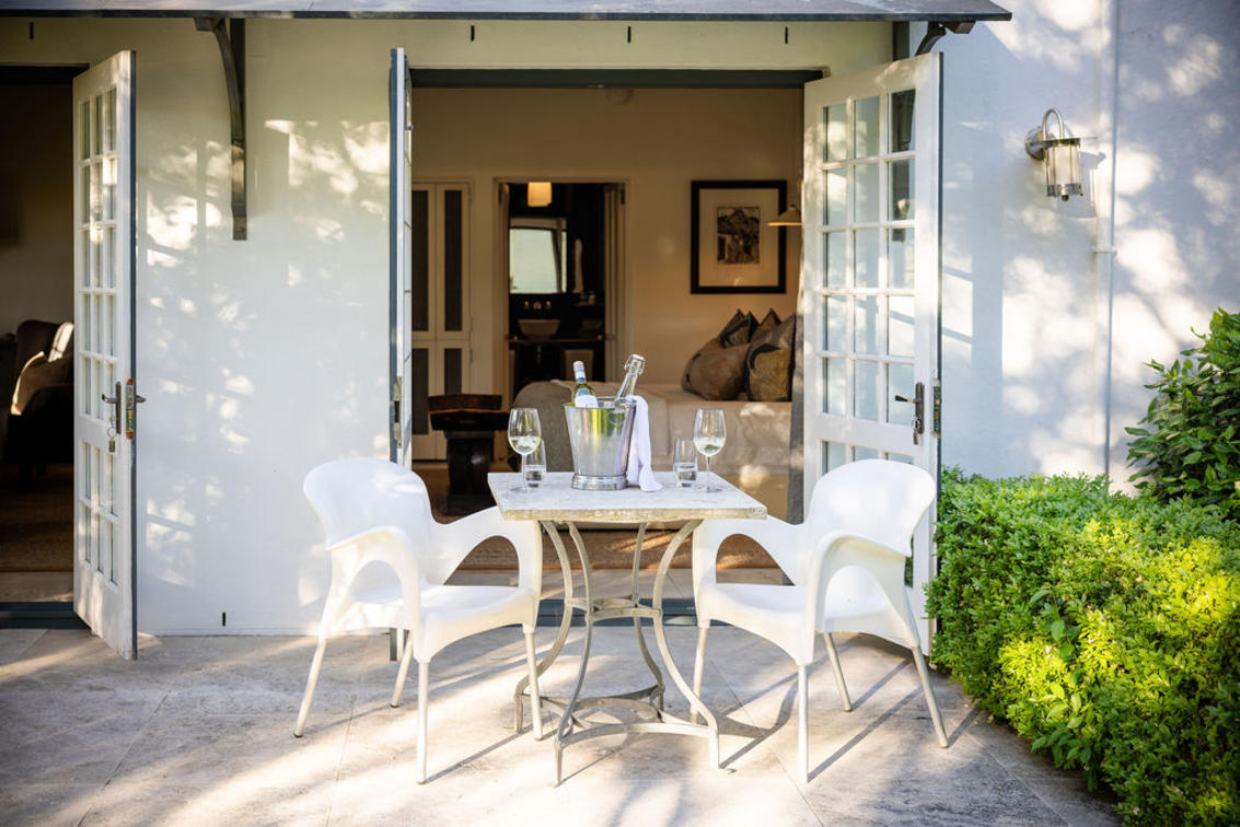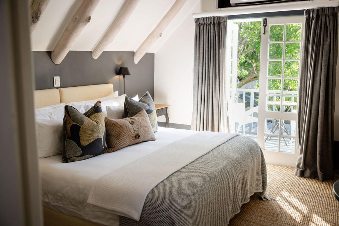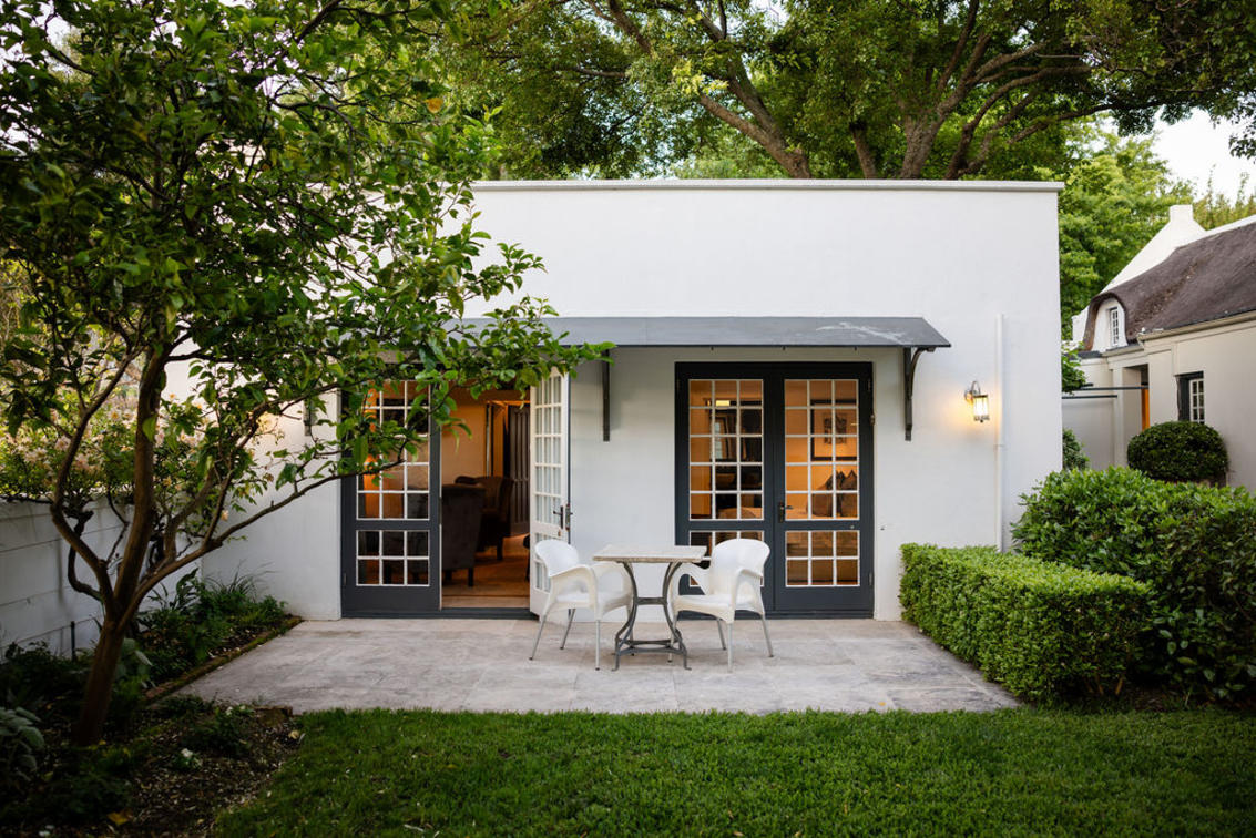 Chambre chic et industrielle au rez-de-chaussée, salle de bains privative luxueuse et spacieuse et articles de toilette. Il s'ouvre sur un patio privé dans le jardin. Lits king/lits jumeaux, linge de maison en percale 400 fils, éclairage tamisé (taille de la chambre : 43 mètres carrés). (Possibilité de réserver l'intégralité du cottage des propriétaires sur la base d'une utilisation exclusive ou en chambre d'hôtes - contactez ownerscottage@grandeprovence.co.za)