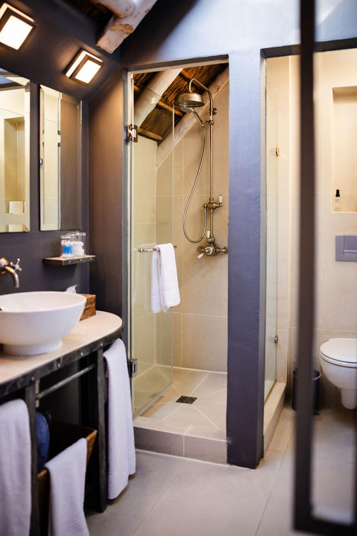 Chambre Loft chic industrielle, ambiance terreuse chaleureuse, salle de bains attenante luxueuse et articles de toilette. Lit king/jumeaux, percale 400 fils, éclairage doux. (Taille de la chambre - 20 mètres carrés) (Possibilité de réserver tout le Cottage Owners à usage exclusif ou en chambre d'hôtes - contactez ownerscottage@grandeprovence.co.za)