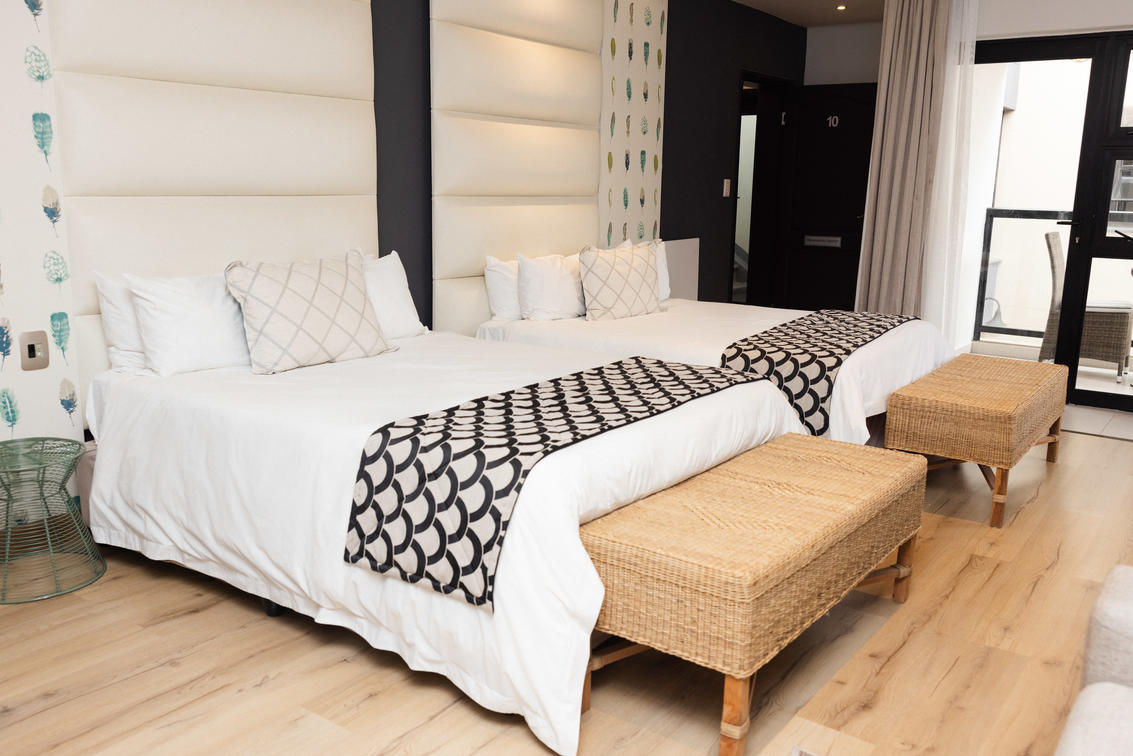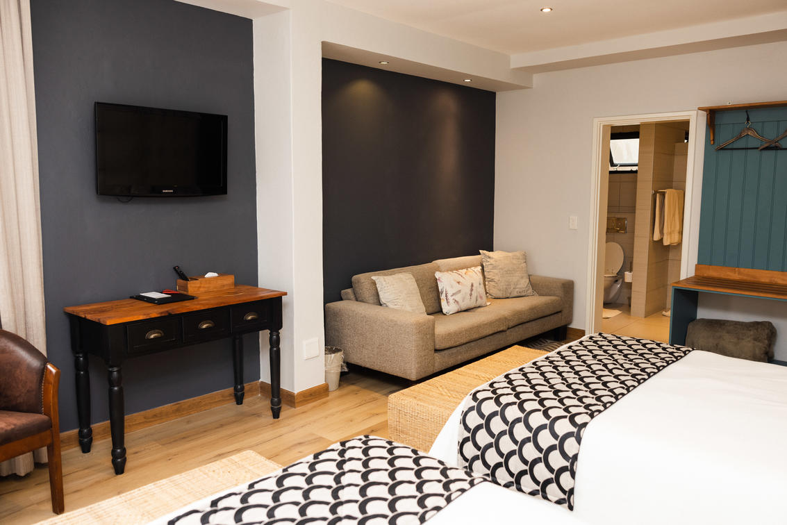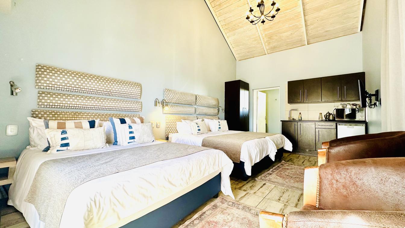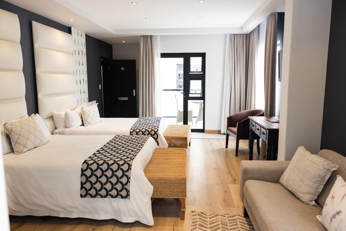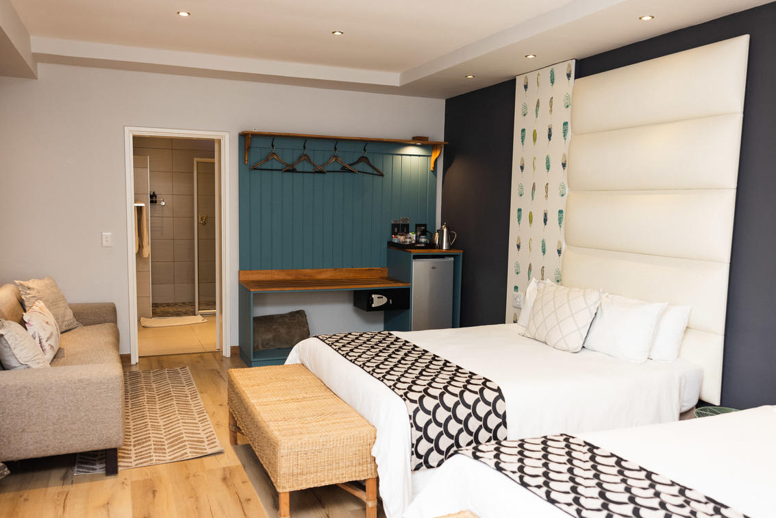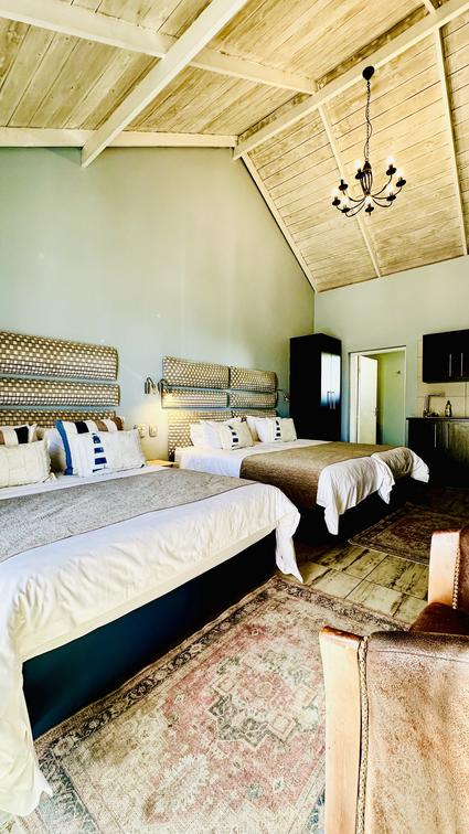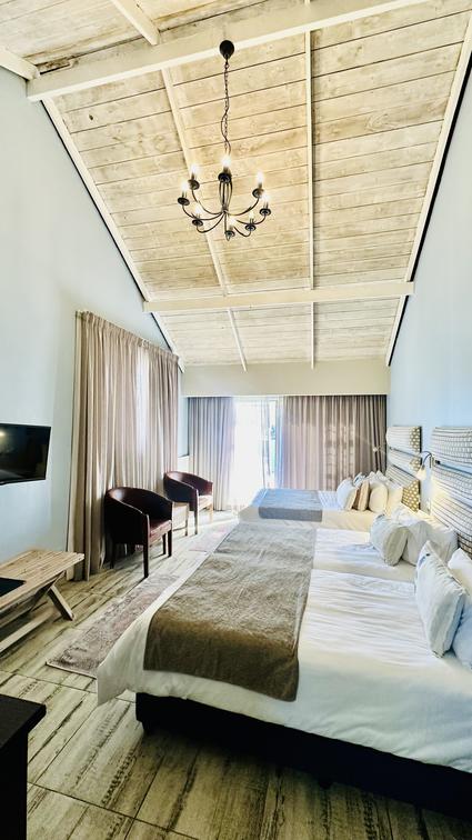 Chambre familiale standard avec 1 x queen size et 2 x lits simples et salle de bains privative.