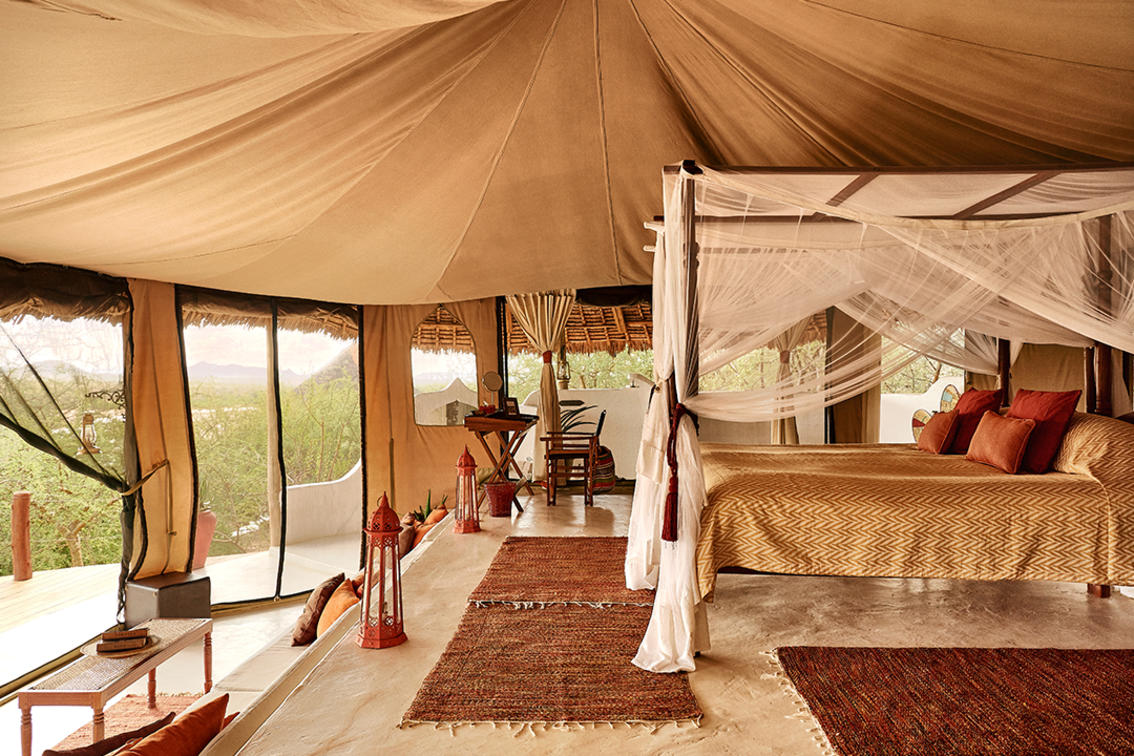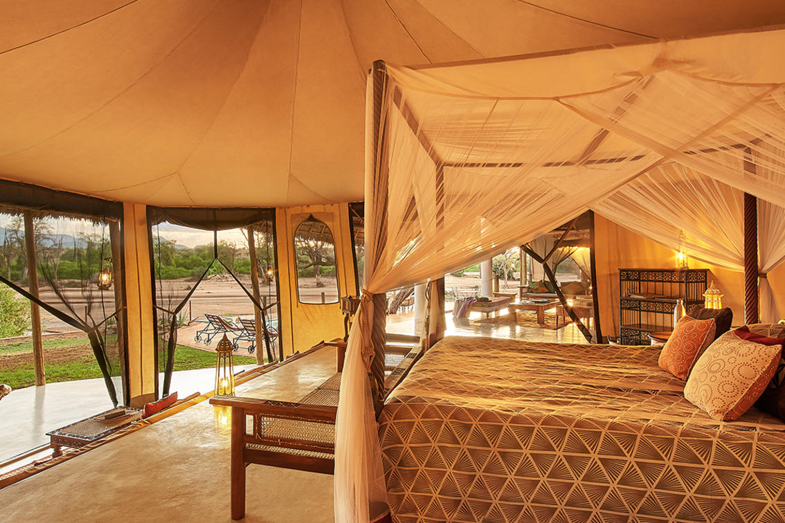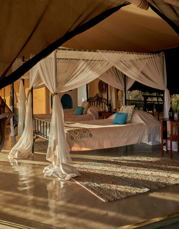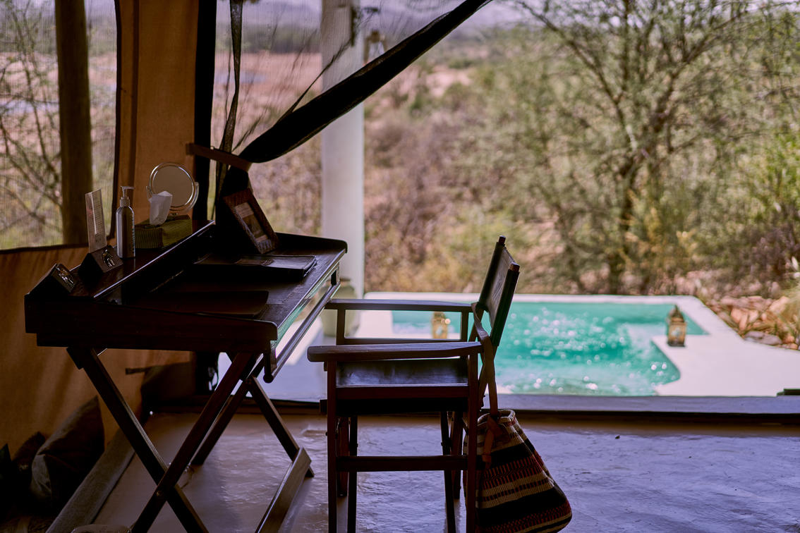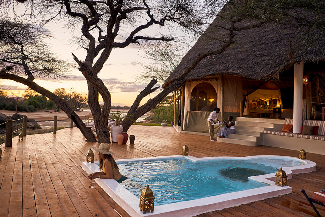Les tentes 10 et 11 constituent une superbe suite familiale Samburu. Perché sur la falaise, non loin de la piscine d'horizon du lodge principal, il offre sérénité et isolement avec une vue imprenable sur la nature sauvage. Le logement est spacieux et comprend une chambre double et une chambre à lits jumeaux, chacune avec sa propre salle de bains, reliées par un îlot central au sein d'un bassin profond aux dimensions généreuses et d'une entrée. Il y a suffisamment d'espace pour lire, observer les oiseaux, faire du yoga et se détendre en général. Des repas privés peuvent être organisés sur demande (sous réserve de disponibilité).