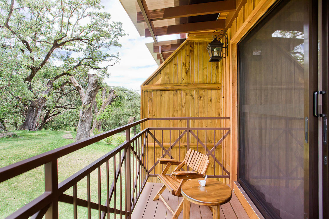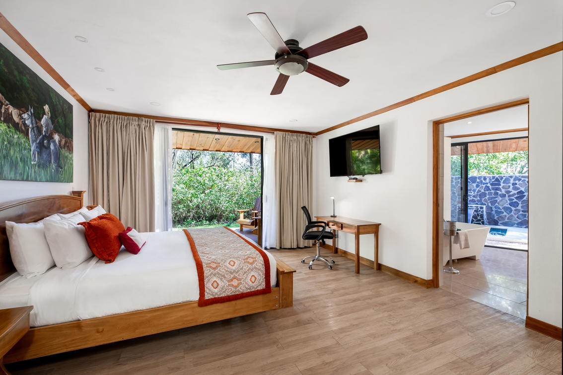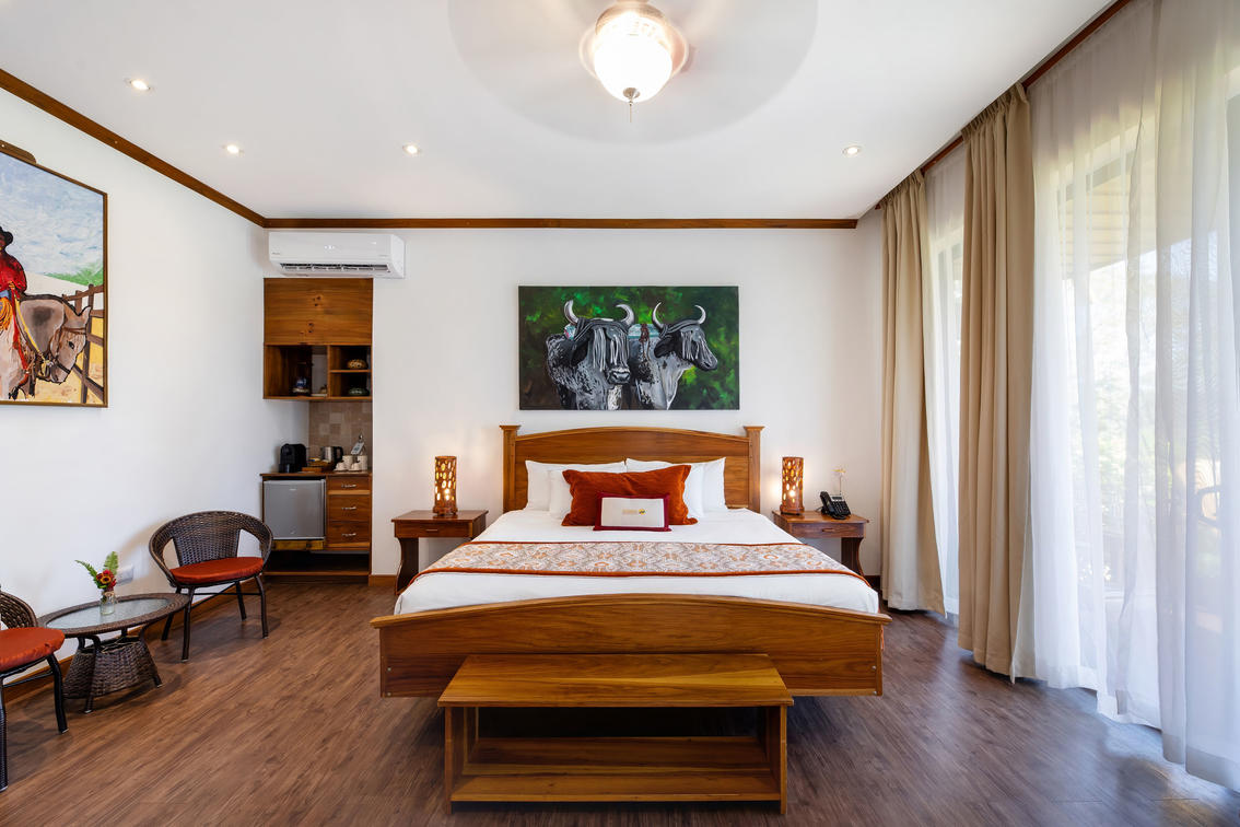 Chaque suite dispose d'un salon décloisonné spacieux décoré avec des meubles costaricains artisanaux et des œuvres d'art représentant la vie traditionnelle du ranch Guanacaste. Les suites sont dotées d'une grande terrasse où vous pourrez admirer la vue imprenable sur le volcan Rincón de la Vieja encadrée par nos beaux jardins tropicaux.